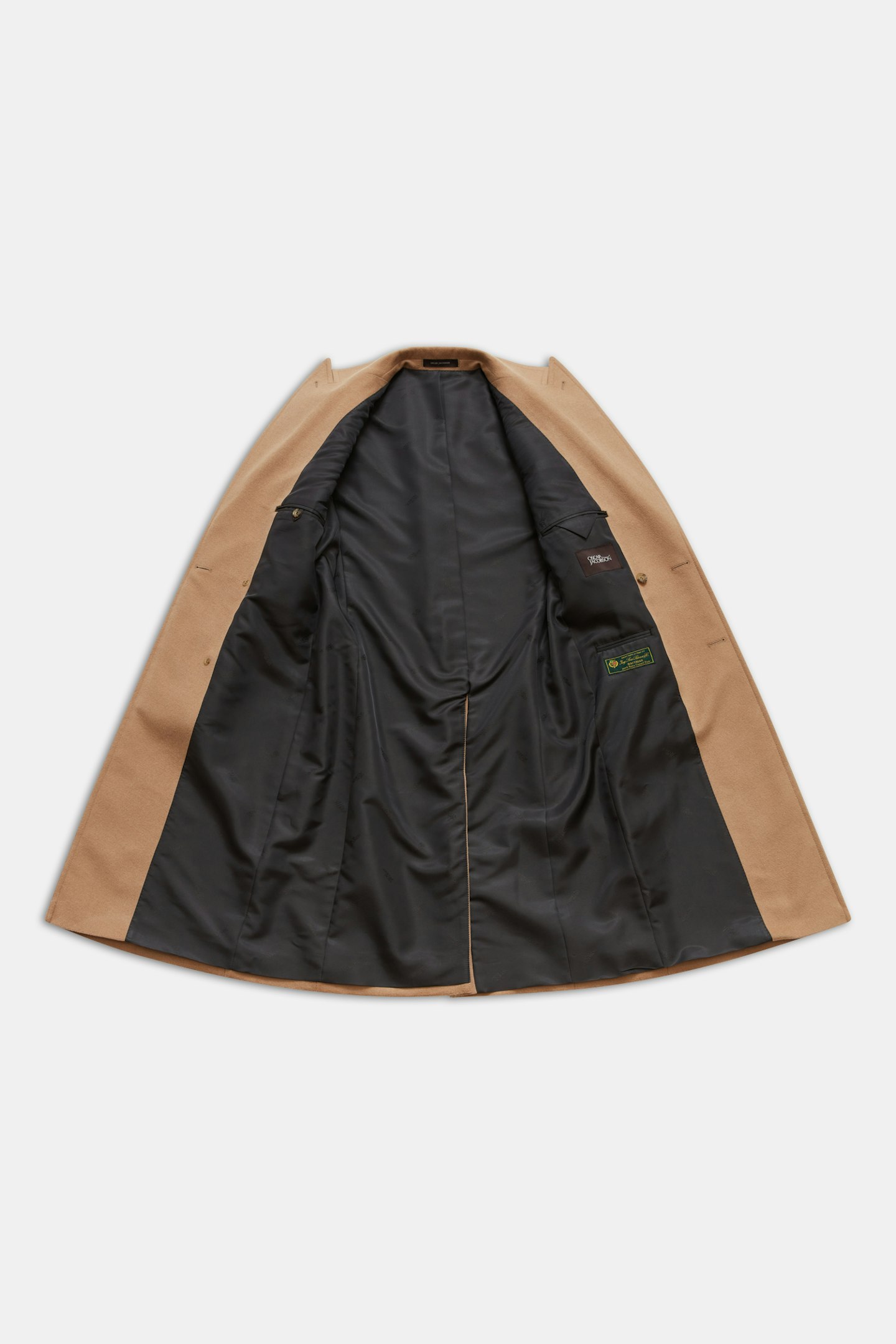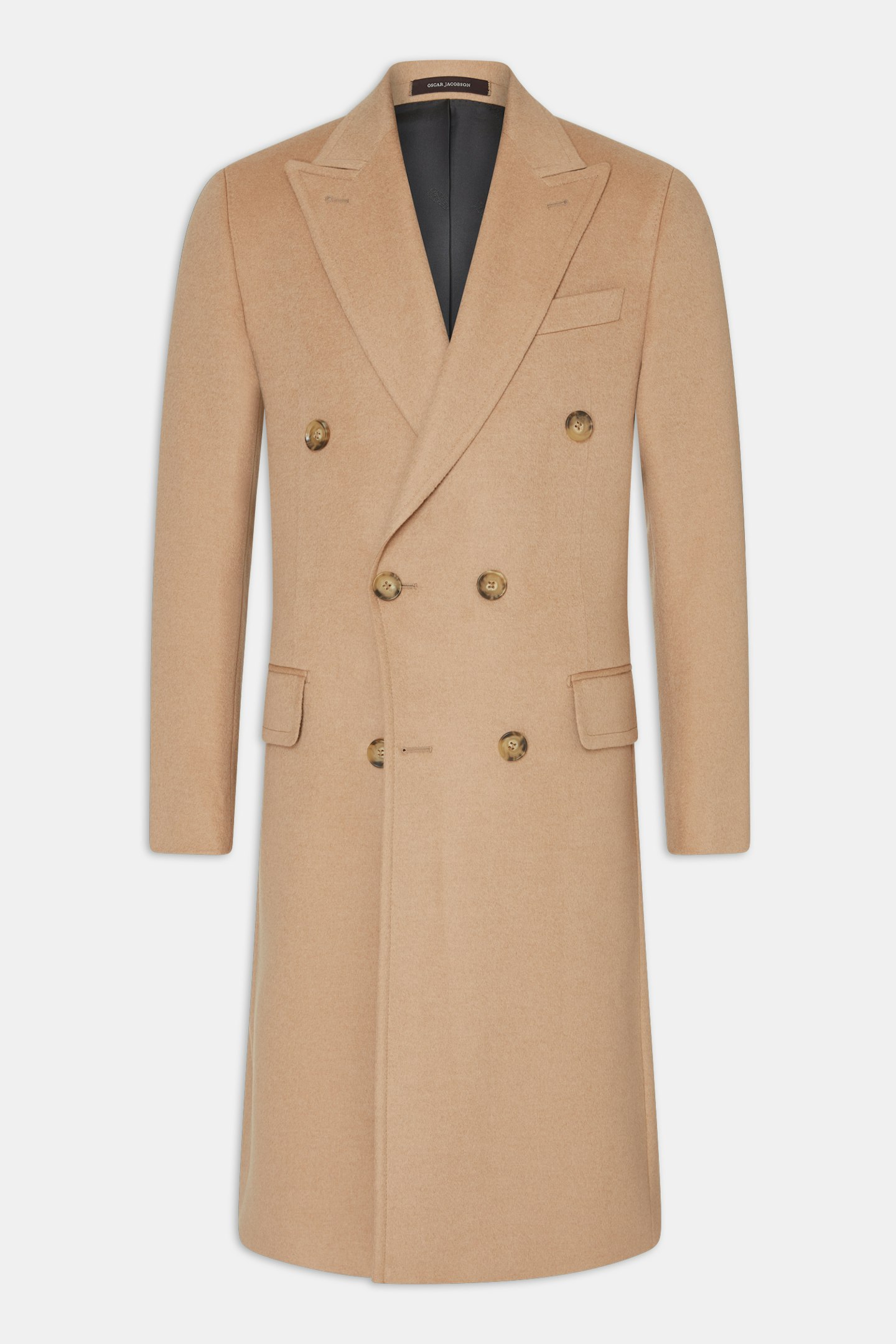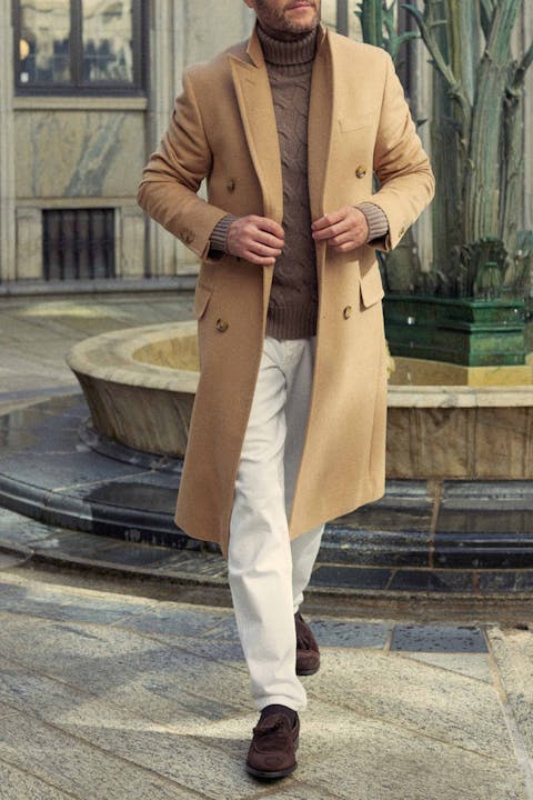 Dobbeltspent Frakke i 100% kamelhår utviklet i samarbeid med Gentlemanualen. Klassisk kåpemodell med spisse slag som passer like godt over en smoking eller mørk dress som over en grovstrikket pologenser og et par hvite jeans. Kamelhåret på kåpen gir en følelse og egenskaper som ligner på kasjmir, men med litt mer tetthet. Produsert av vår italienske leverandør Loro Piana.
