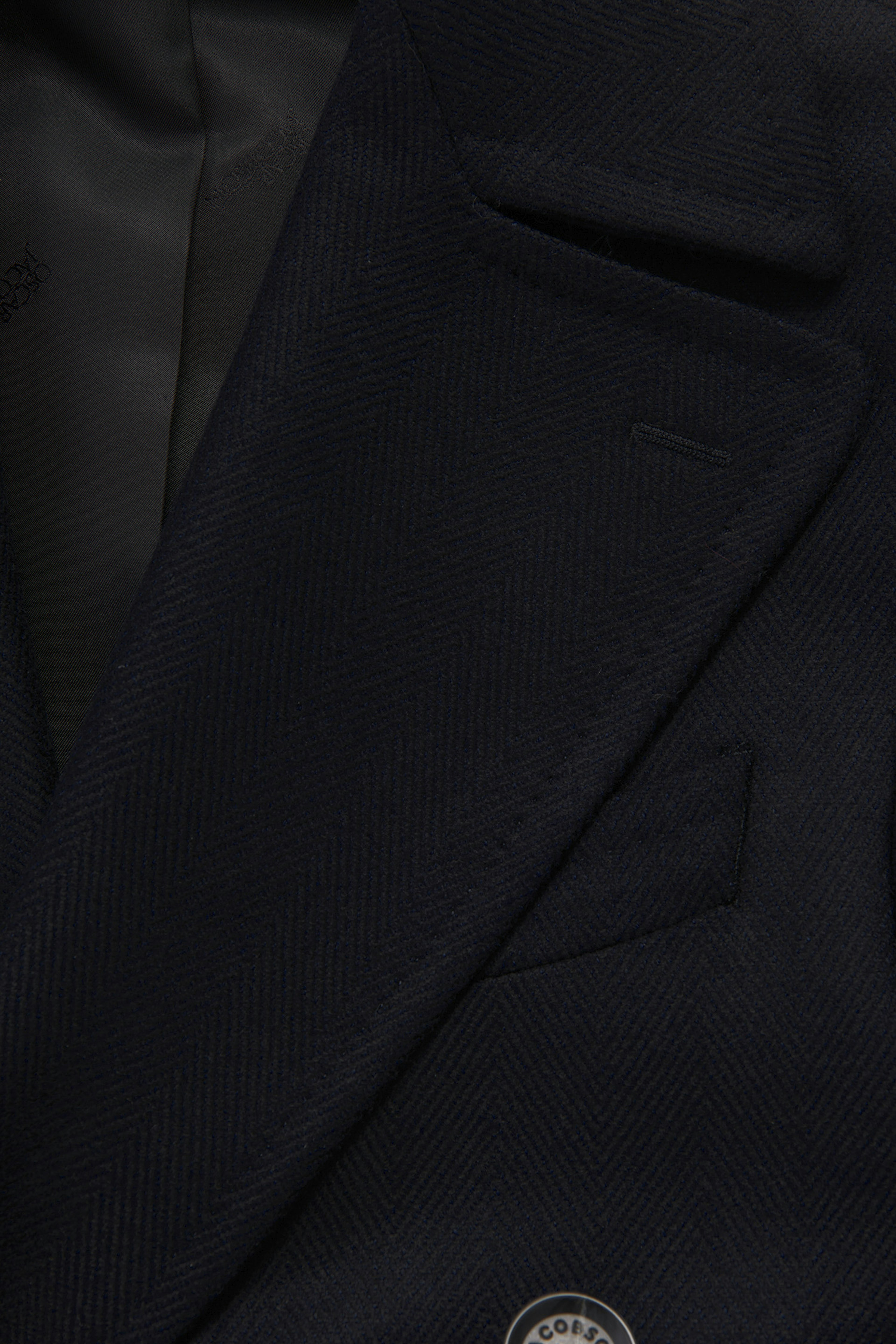 Klassisk dobbeltspent polo coat utstyrt med utenpåliggende lommer og doble innerlommer. Stoff av en kasjmir- og ullblanding med fiskebenstruktur.
