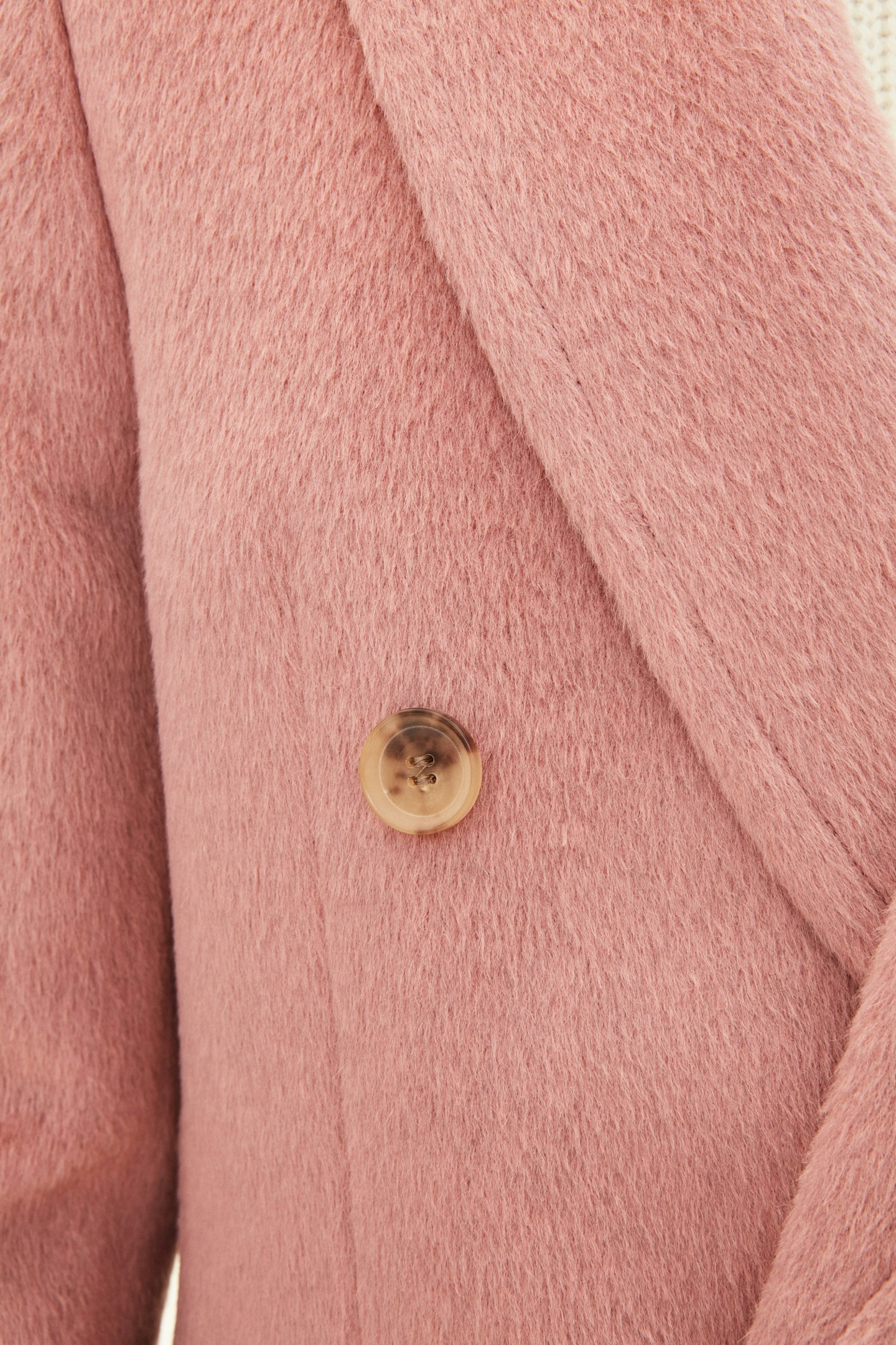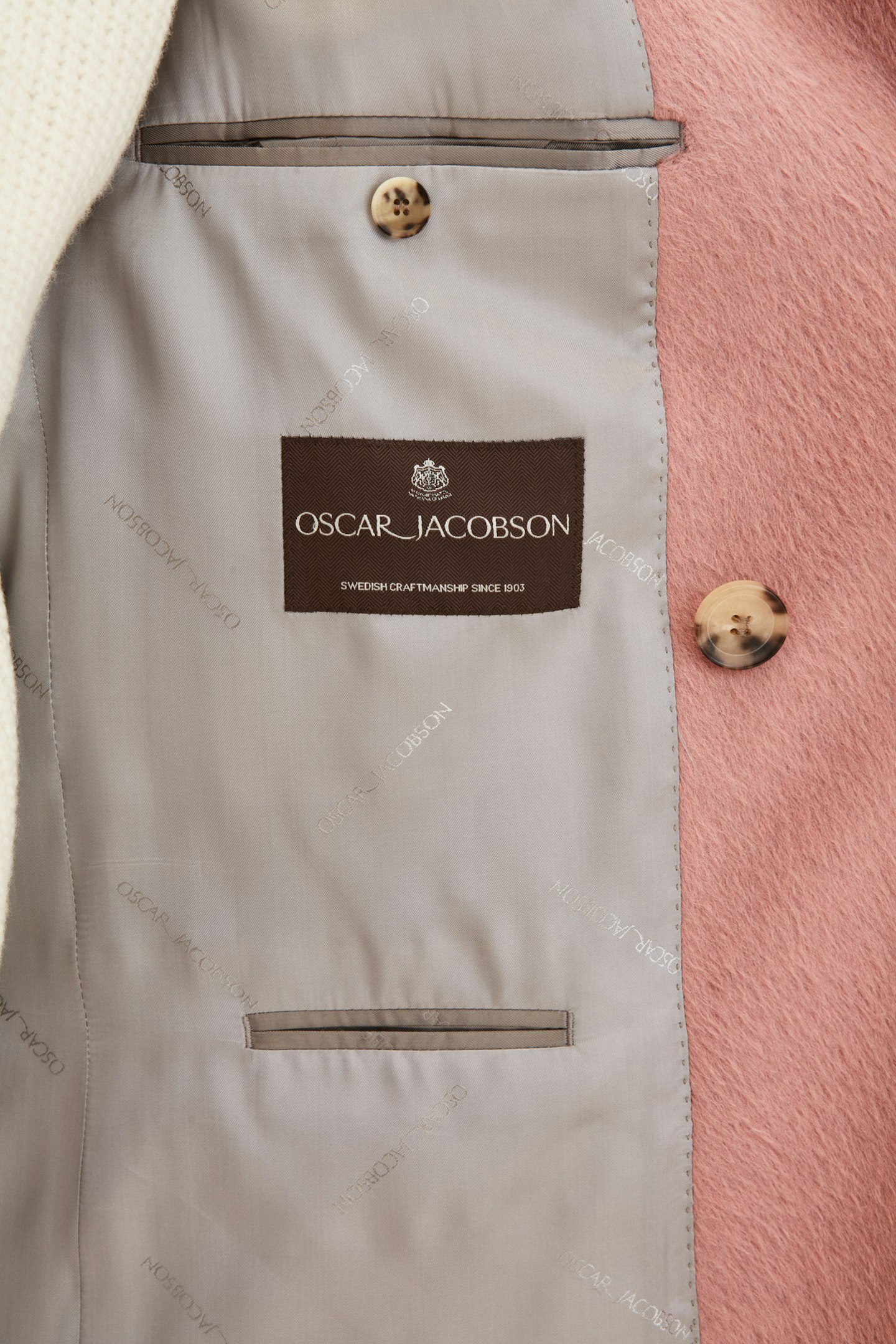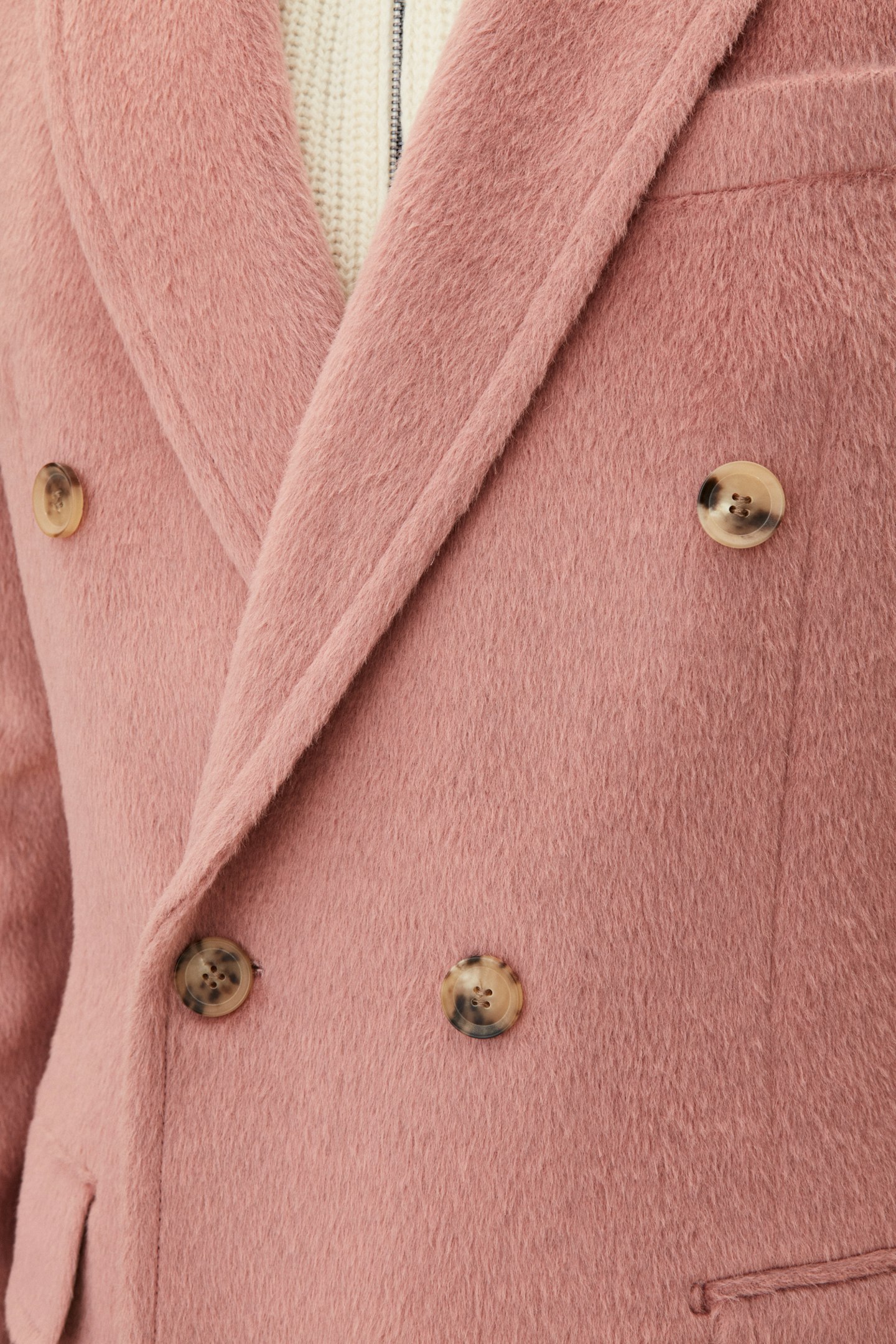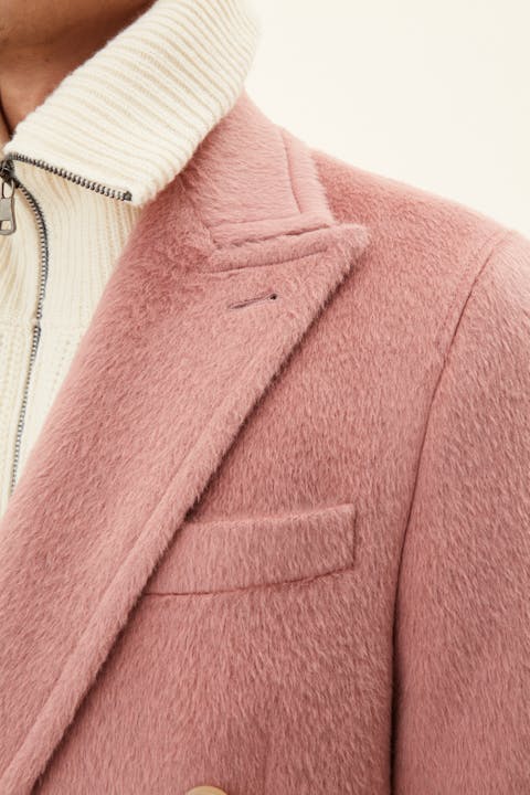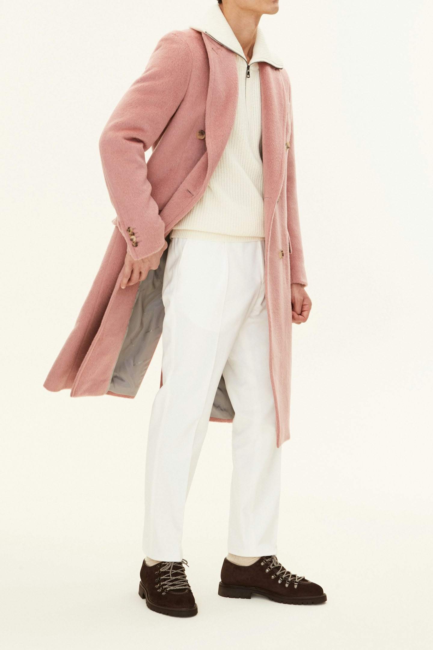 Arezzo-frakken er en dobbeltspent modell med spisse jakkeslag, laget av en eksklusiv blanding av baby lama og ull fra den anerkjente veveren Piacenza. Den sofistikerte beverfinishen gir en myk og slitesterk overflate, med en subtil glans som fremhever kvaliteten på materialet. Den rosa nyansen gir et elegant preg, mens designet sørger for en flatterende silhuett. Piacenza har en lang tradisjon for håndverk og kvalitet, noe som gjør denne kåpen til et eksempel på tidløs eleganse og omhyggelig håndverk.