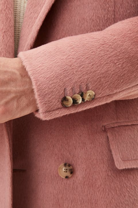 Arezzo-frakken er en dobbeltspent modell med spisse jakkeslag, laget av en eksklusiv blanding av baby lama og ull fra den anerkjente veveren Piacenza. Den sofistikerte beverfinishen gir en myk og slitesterk overflate, med en subtil glans som fremhever kvaliteten på materialet. Den rosa nyansen gir et elegant preg, mens designet sørger for en flatterende silhuett. Piacenza har en lang tradisjon for håndverk og kvalitet, noe som gjør denne kåpen til et eksempel på tidløs eleganse og omhyggelig håndverk.
