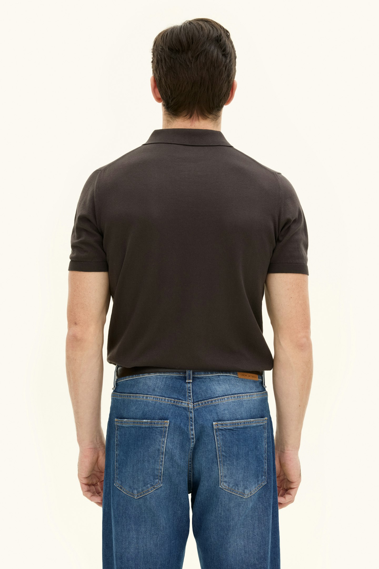 Kortermet genser med krage, laget av finstrikket økologisk bomull. Utstyrt med elegant glidelås i kragen.