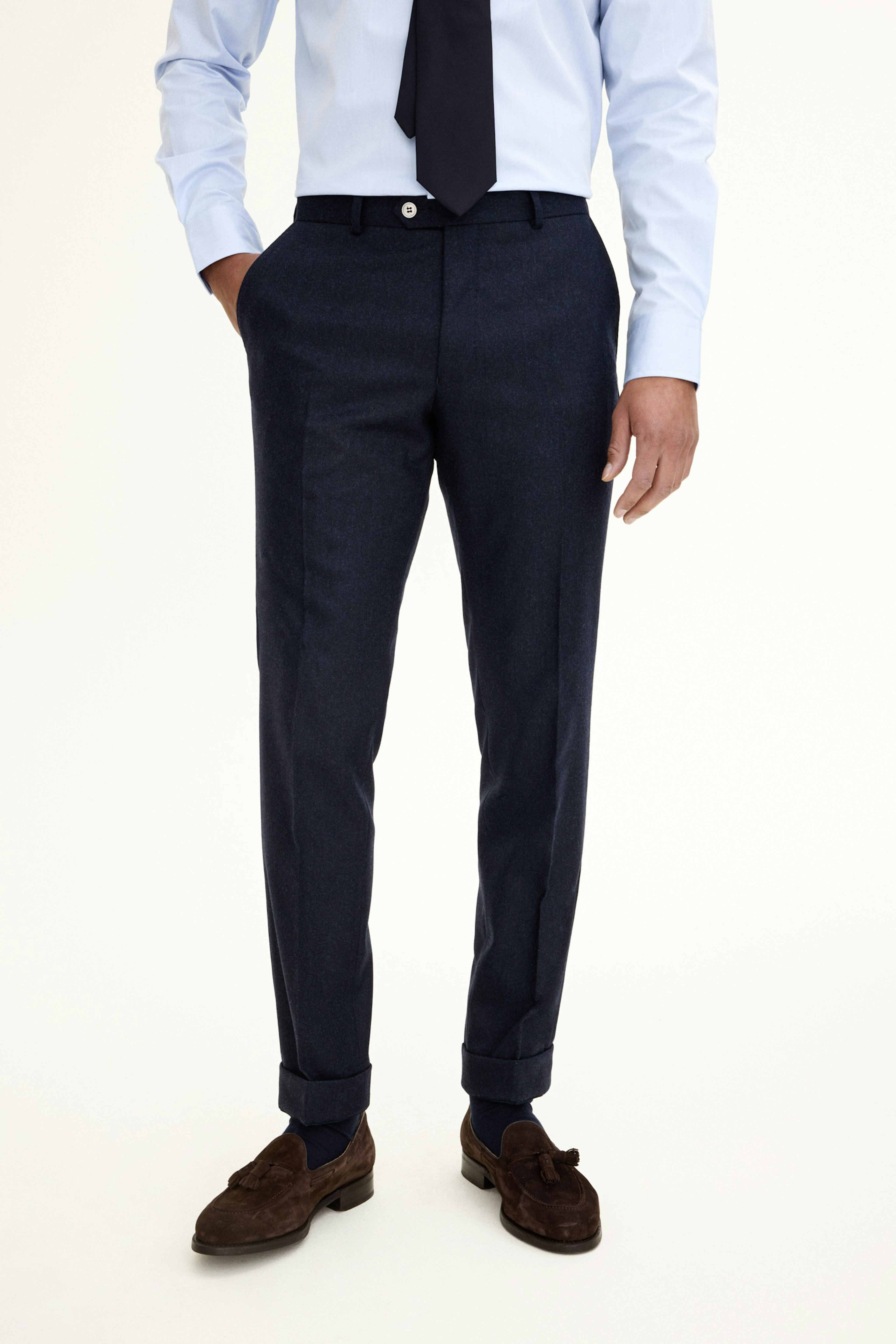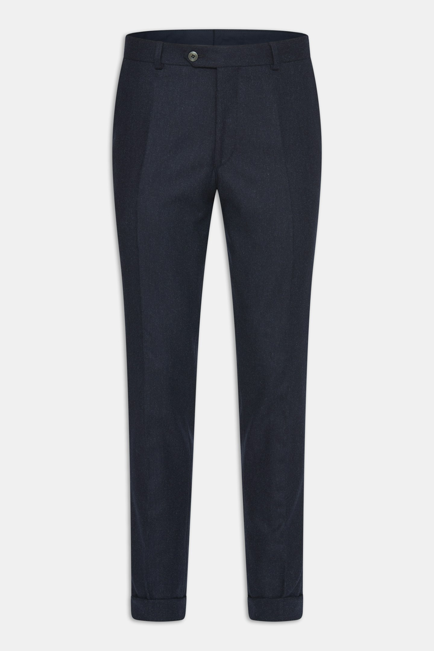 Dressbukser med smal passform, oppbrett og normalt høyt liv. Italiensk flanell av ull som gir en naturlig varme og høy pusteevne.