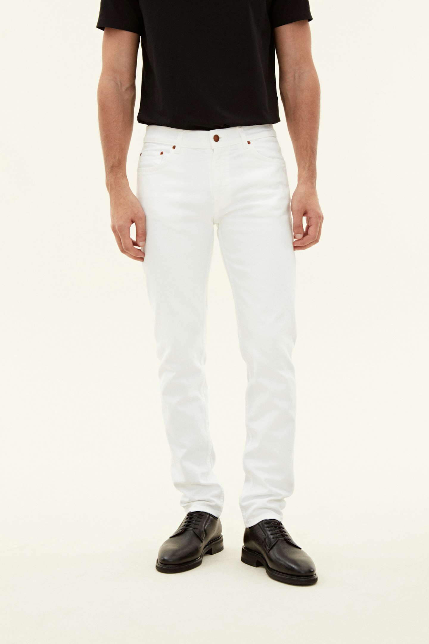 Passformen er smal med rette ben, livet har lav til normal høyde. Laget av denim med strech fra Candiani i Italia, som er vevd på gamle vevstoler fra Levis med knapper og nagler fra Italia og Borås. Jeansene er laget av 100% bærekraftig dyrket bomull.