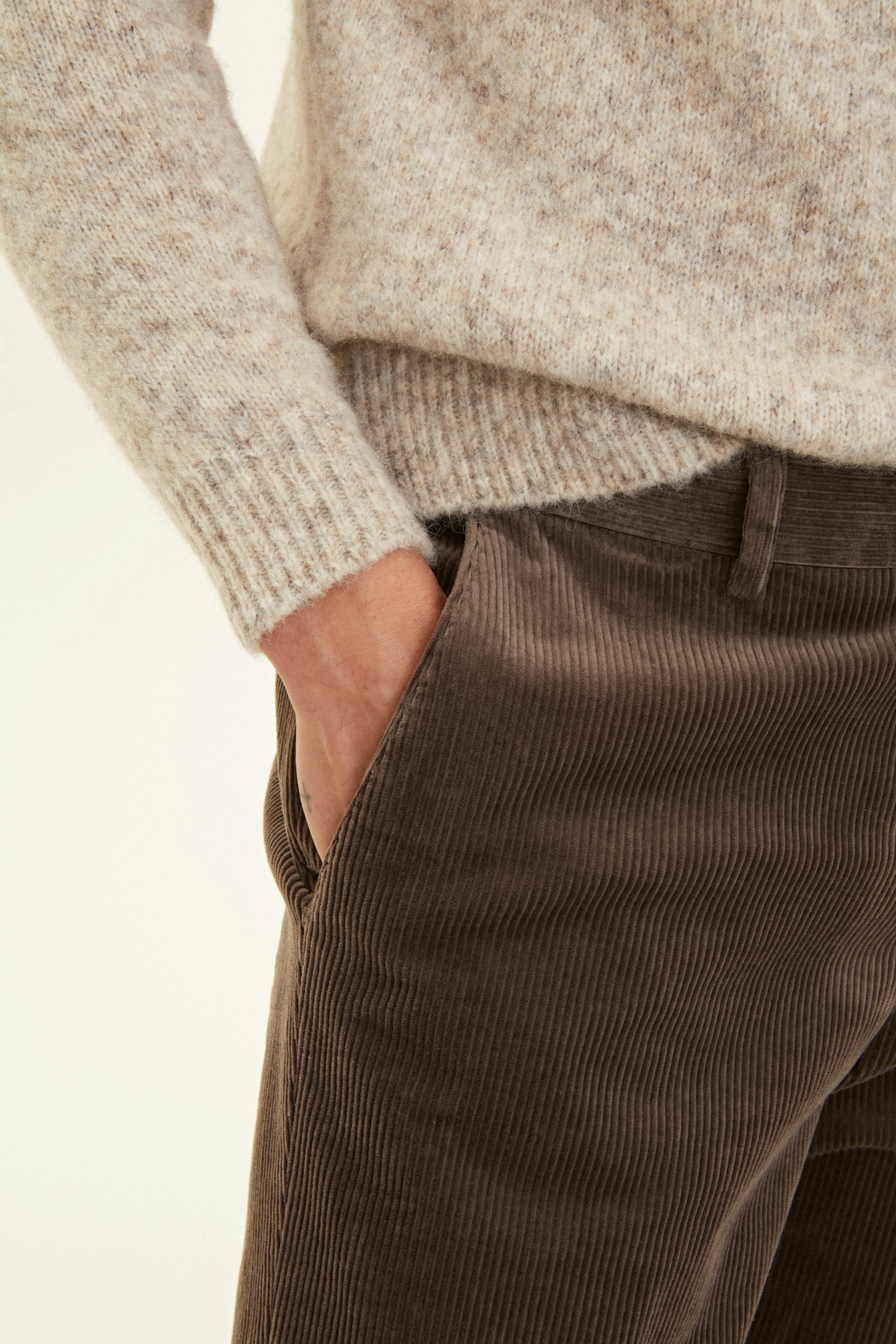Bred kordfløyelbukse med fleksibel stretch! Denne modellen er smal i passformen og har en stilsikker, litt kortere benlengde enn de klassiske dressbuksene. Det betyr at buksebenet slutter rett over skoen uten å være nær skoen. Kan med fordel brukes sammen med en jakke i litt tykkere stoff, oxfordskjorte og brogues