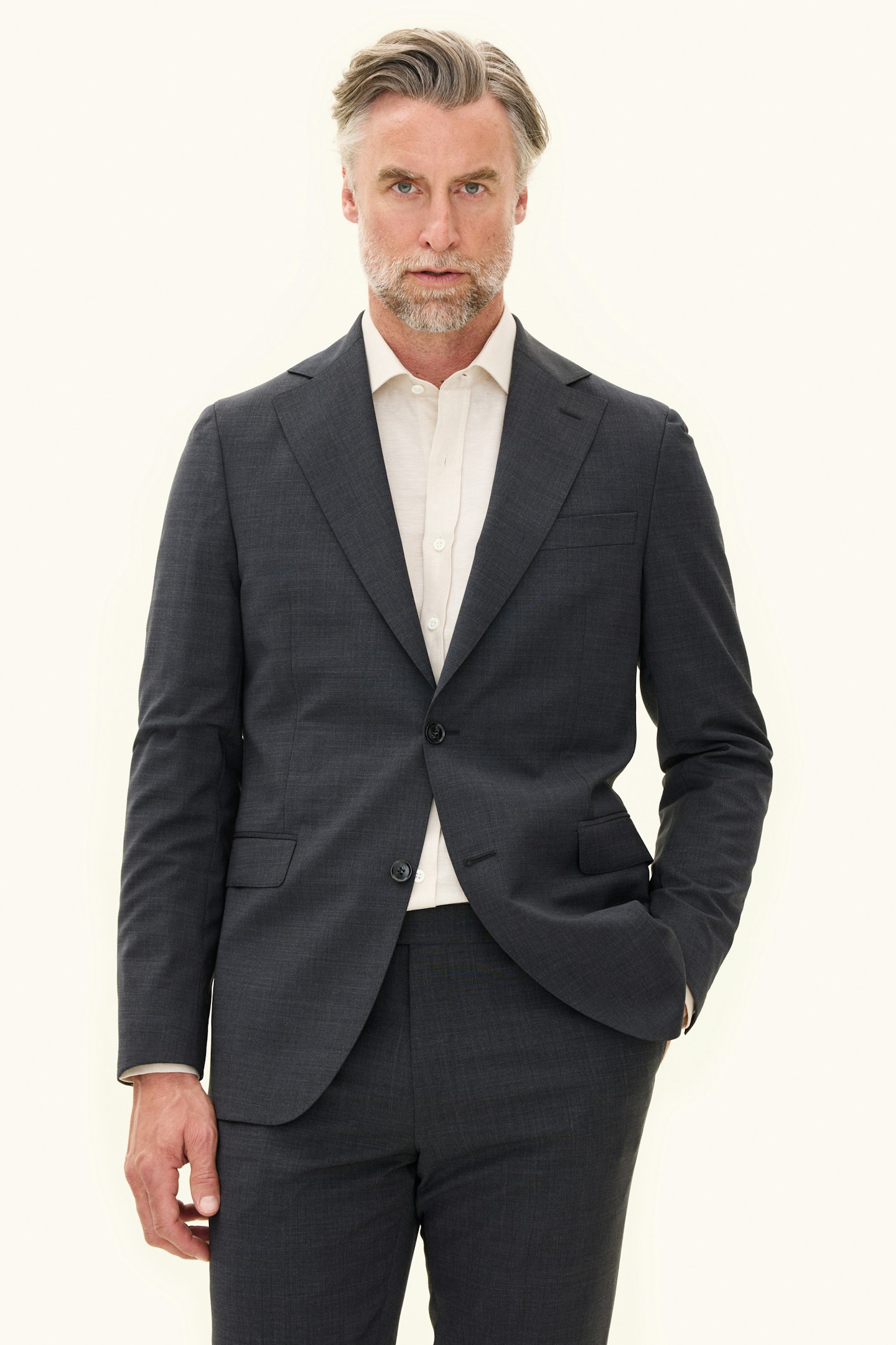 Klassisk blazer med en smal passform som passer like godt til bryllup og konfirmasjonsfeiringer som til kontoret. Stoffet er en glatt og slitesterk ullstretch som egner seg godt til hverdagen.
