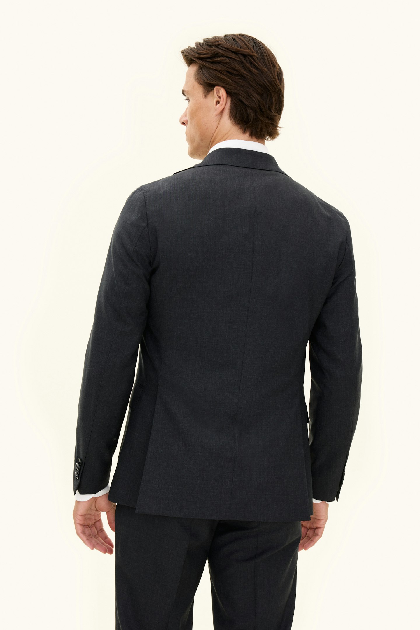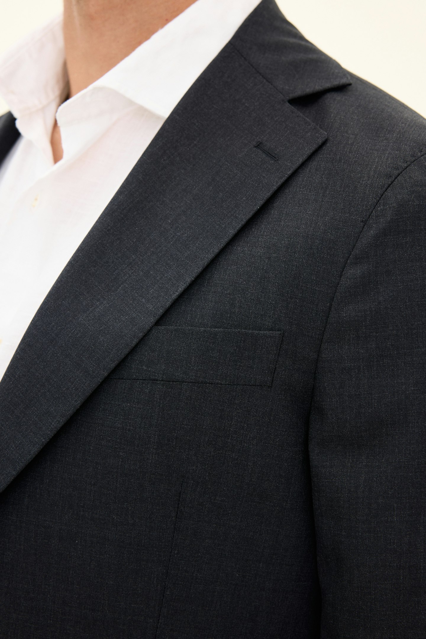 Single breasted blazer in slim fit made from an Italian super 120's wool. The blazer has a fully lined inside, a soft constructed shoulder and flap pockets.