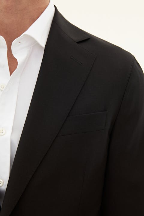 Single breasted blazer in slim fit made from an Italian super 120's wool. The blazer has a fully lined inside, a soft constructed shoulder and flap pockets.