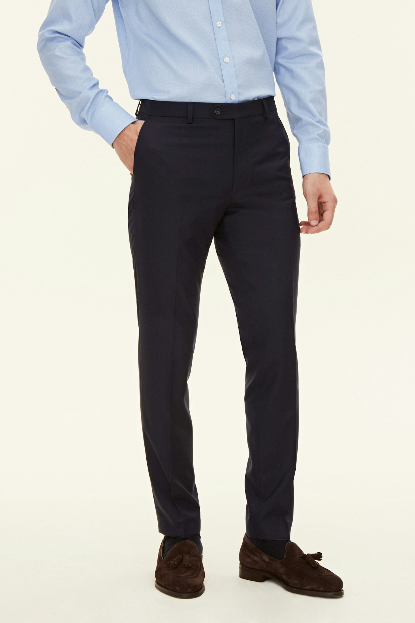 Klassisk dressbukse i slitesterk super 120’s ull. Denne modellen har en smalere passform og en klassisk bukselengde som så vidt berører buksen, og bidrar til et elegant kutt.