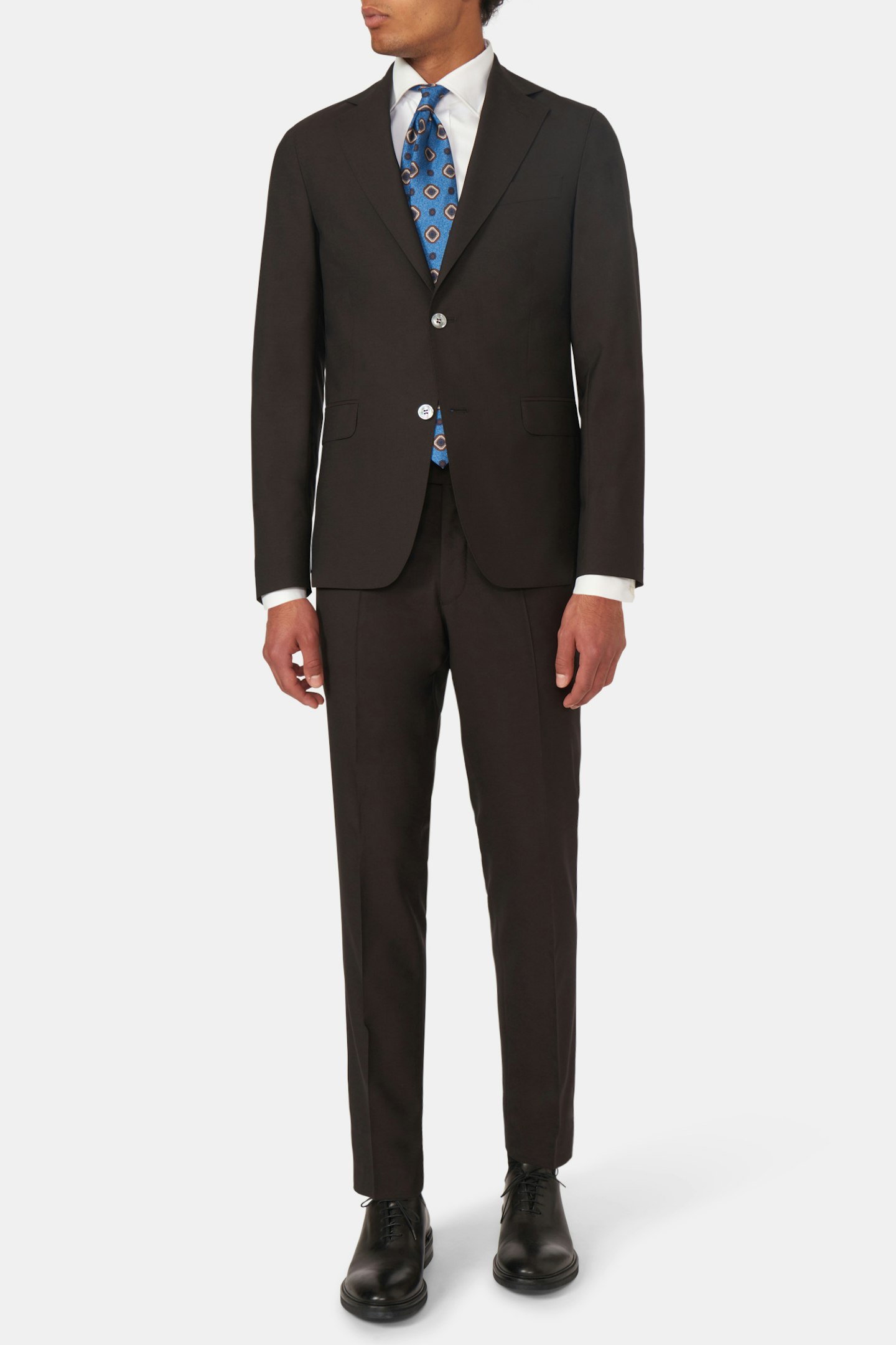Helfôret dressjakke med ekstra myk skulder og brede slag. Flat-front bukse med normalhøy midje.