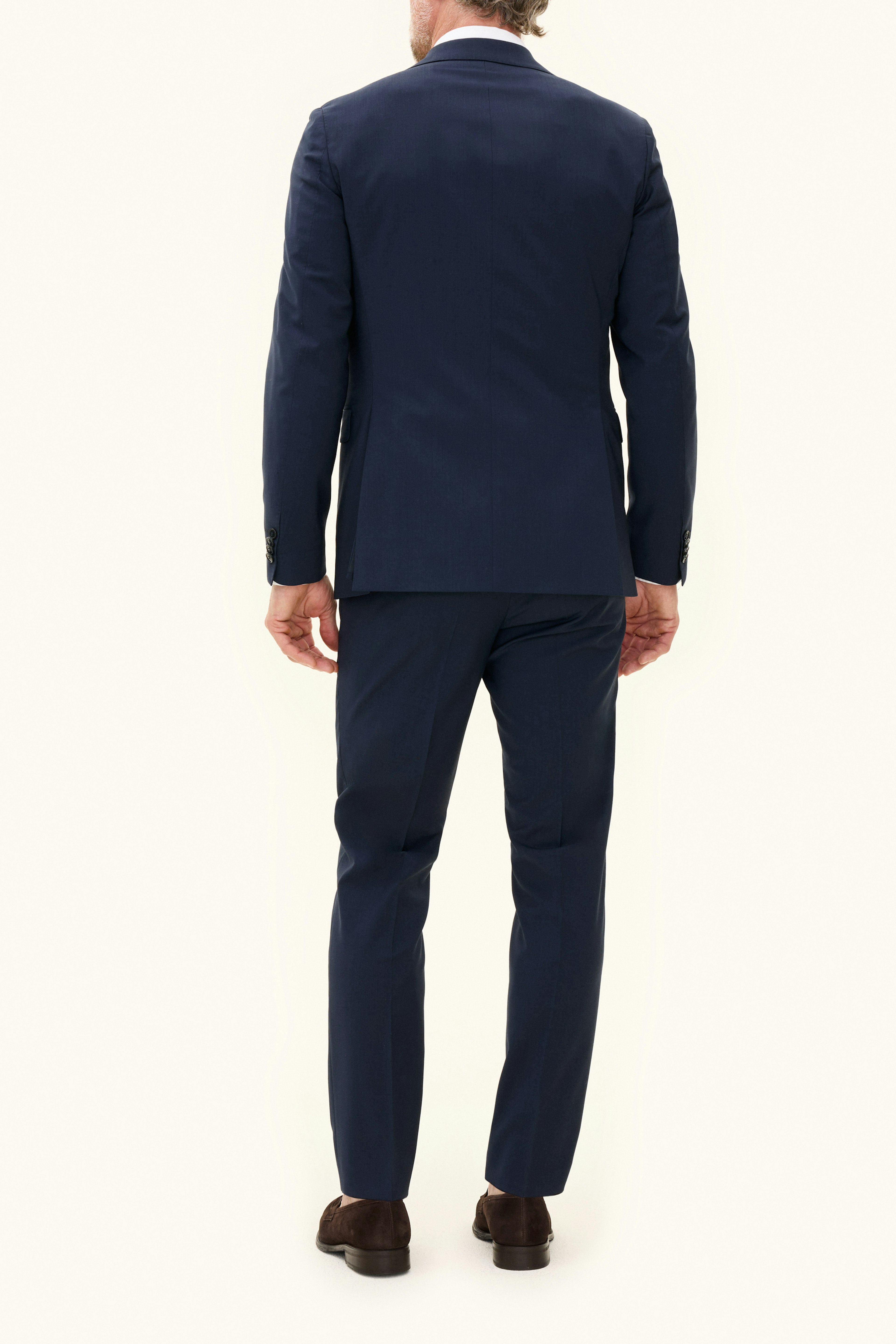 Klubbkostym i mørkeblått ullgarn med struktur fra det italienske veveriet Marzotto. En myk konstruksjon der mellomlegg og skulderoppbygging er nærmest fraværende. Jakken er foret og har lommer med klaff. Tilhørende bukser har en klassisk, noe avsmalnende passform og en normalhøy midje.