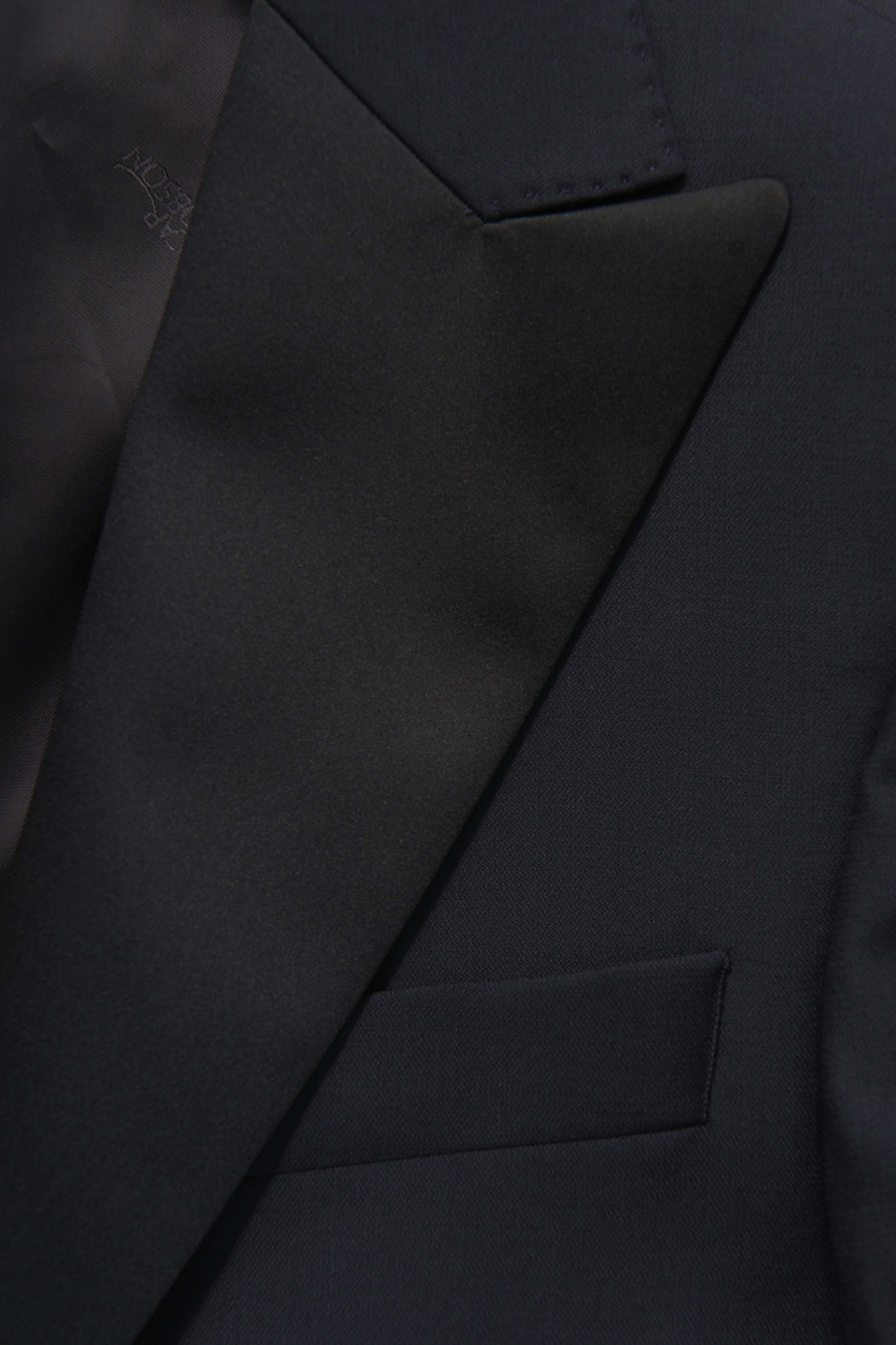 Denne smoking blazer har et klassisk i utseende og har en moderne slim passform. Slagene er som de skal være: Spisse, elegant brede og laget av silke. Materialet i jakken er et fint vevd smokingstoff av 100% ull. Velg mellom de klassiske fargene svart eller midnattsblå.
