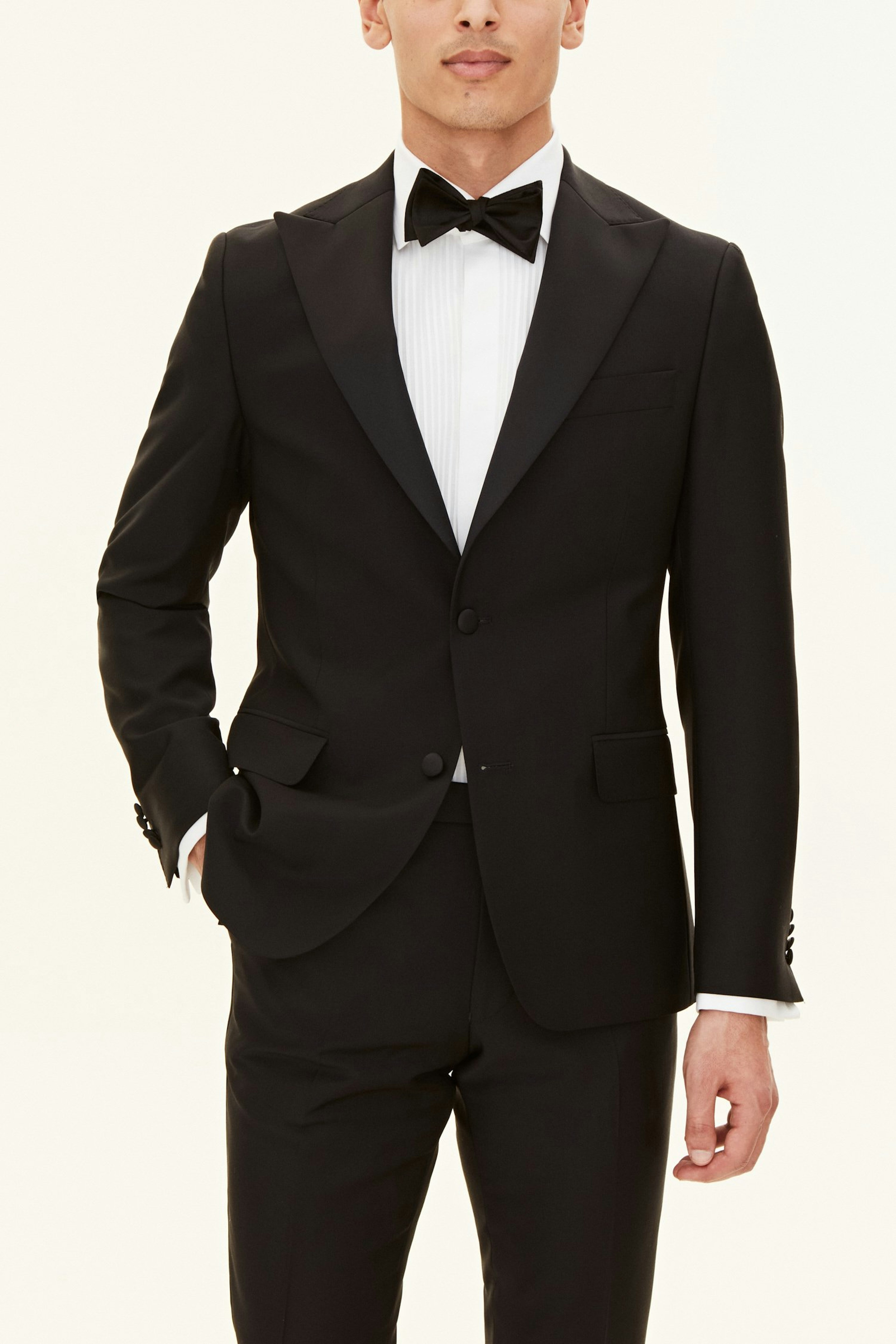 Denne smoking blazer har et klassisk i utseende og har en moderne slim passform. Slagene er som de skal være: Spisse, elegant brede og laget av silke. Materialet i jakken er et fint vevd smokingstoff av 100% ull. Velg mellom de klassiske fargene svart eller midnattsblå.