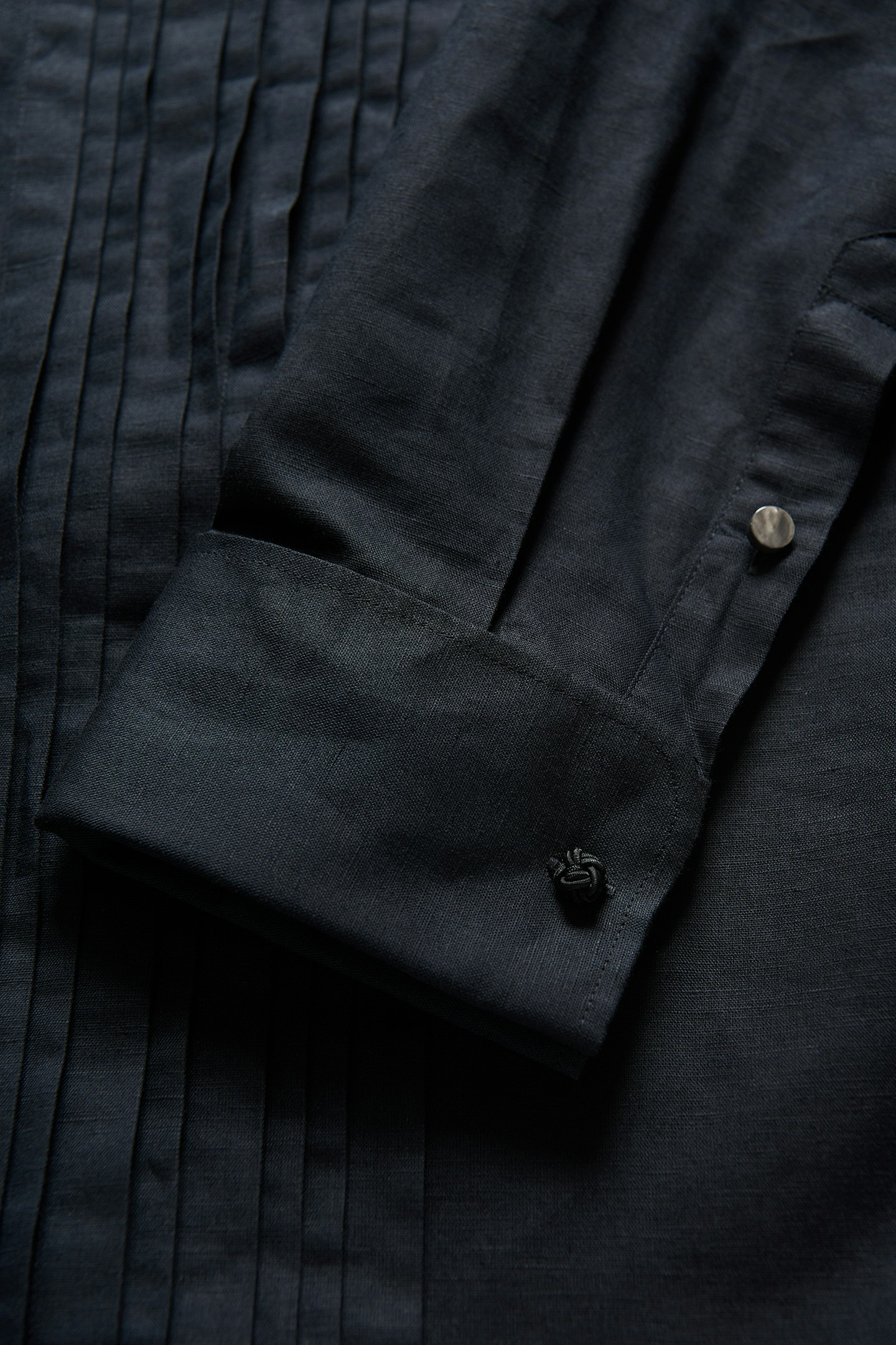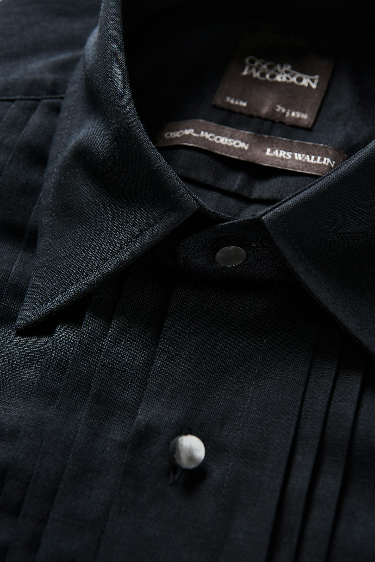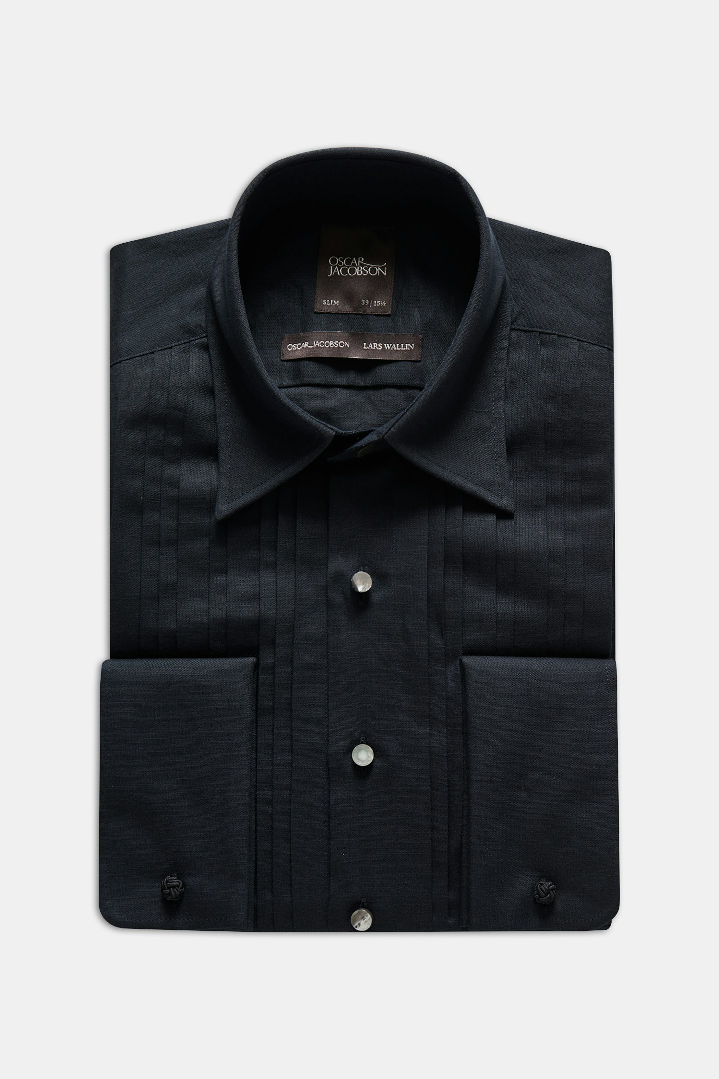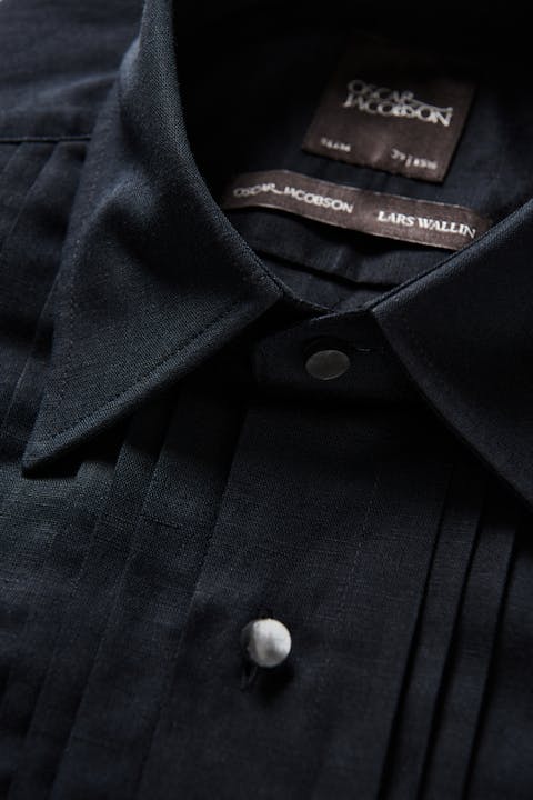 Tuxedo-skjorte i slim fit med spiss krage laget av en blanding av lin og bomull. Produktet er utviklet i samarbeid med den svenske designeren Lars Wallin. Basert på en felles visjon om kvalitet og bærekraftighet, samt lengselen etter hverdagsluksus, har vi skapt en moderne festkolleksjon ved å bruke de beste kvalitetene og med perfekt passform.