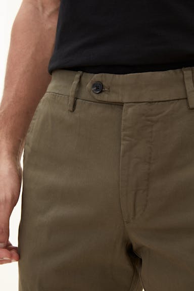 En oppdatert versjon av de klassiske chinos-buksene. Denne modellen er slim fit, har normalt høyt liv og en benlengde der buksene slutter rett over skoen og har et naturlig fall. Livet er utstyrt med sidejusteringer – en stilig detalj som også kan brukes til å gjøre midjemålet på buksen noen cm mindre.
