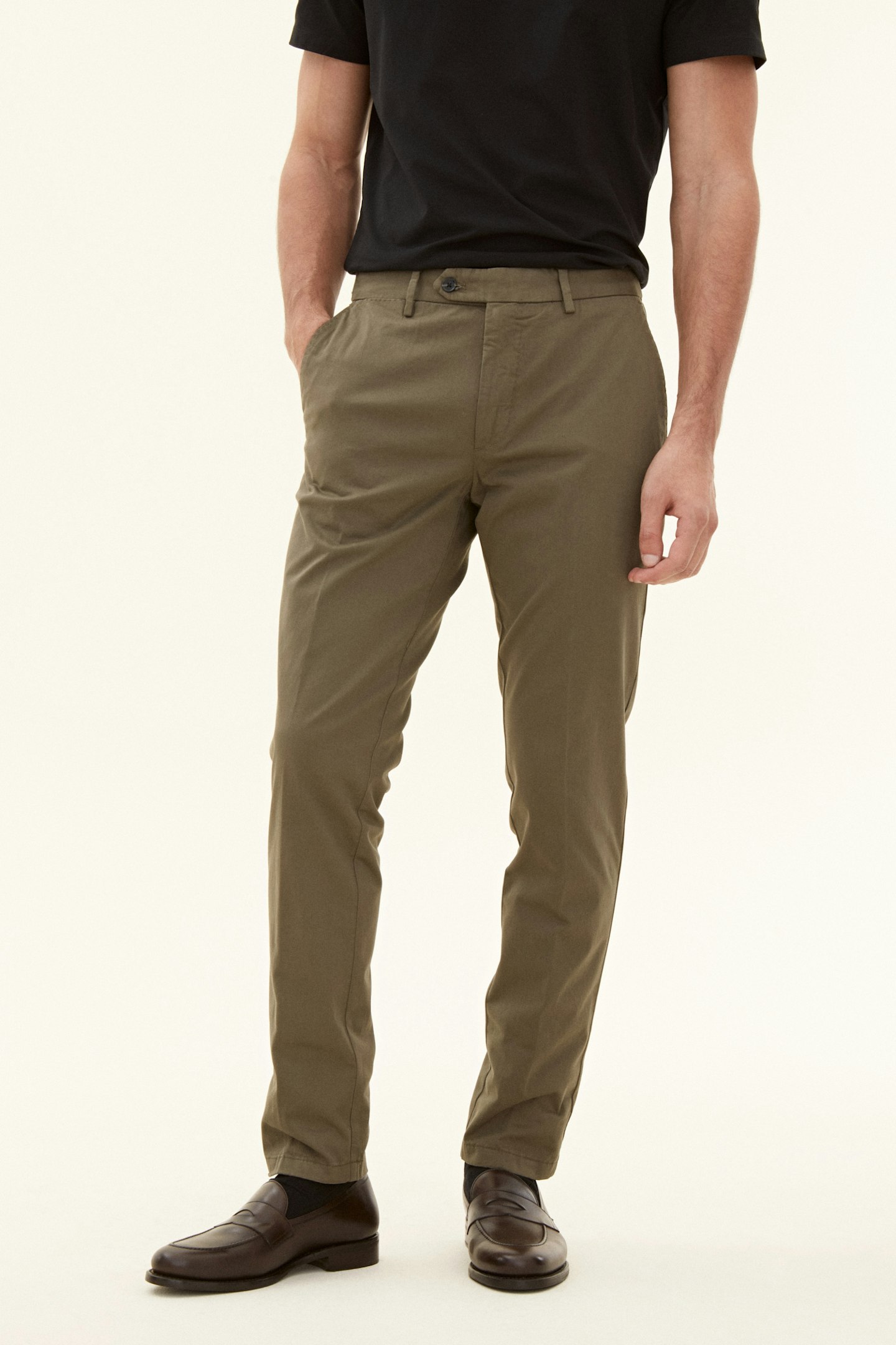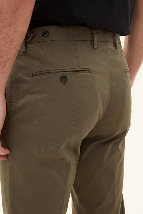 En oppdatert versjon av de klassiske chinos-buksene. Denne modellen er slim fit, har normalt høyt liv og en benlengde der buksene slutter rett over skoen og har et naturlig fall. Livet er utstyrt med sidejusteringer – en stilig detalj som også kan brukes til å gjøre midjemålet på buksen noen cm mindre.