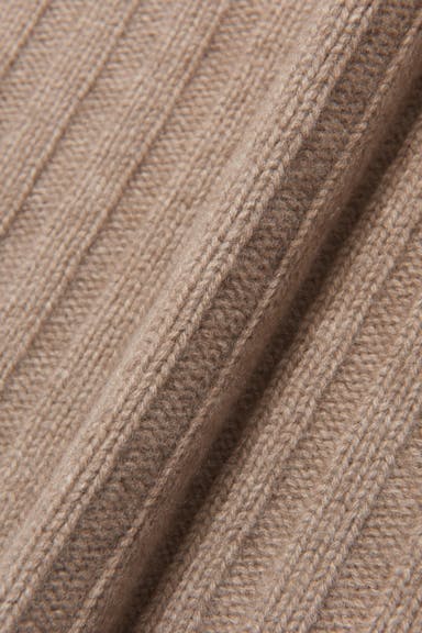 Ribbet skjerf i kasjmir. Skjerfet er sydd sammen og kan trekkes over hodet.