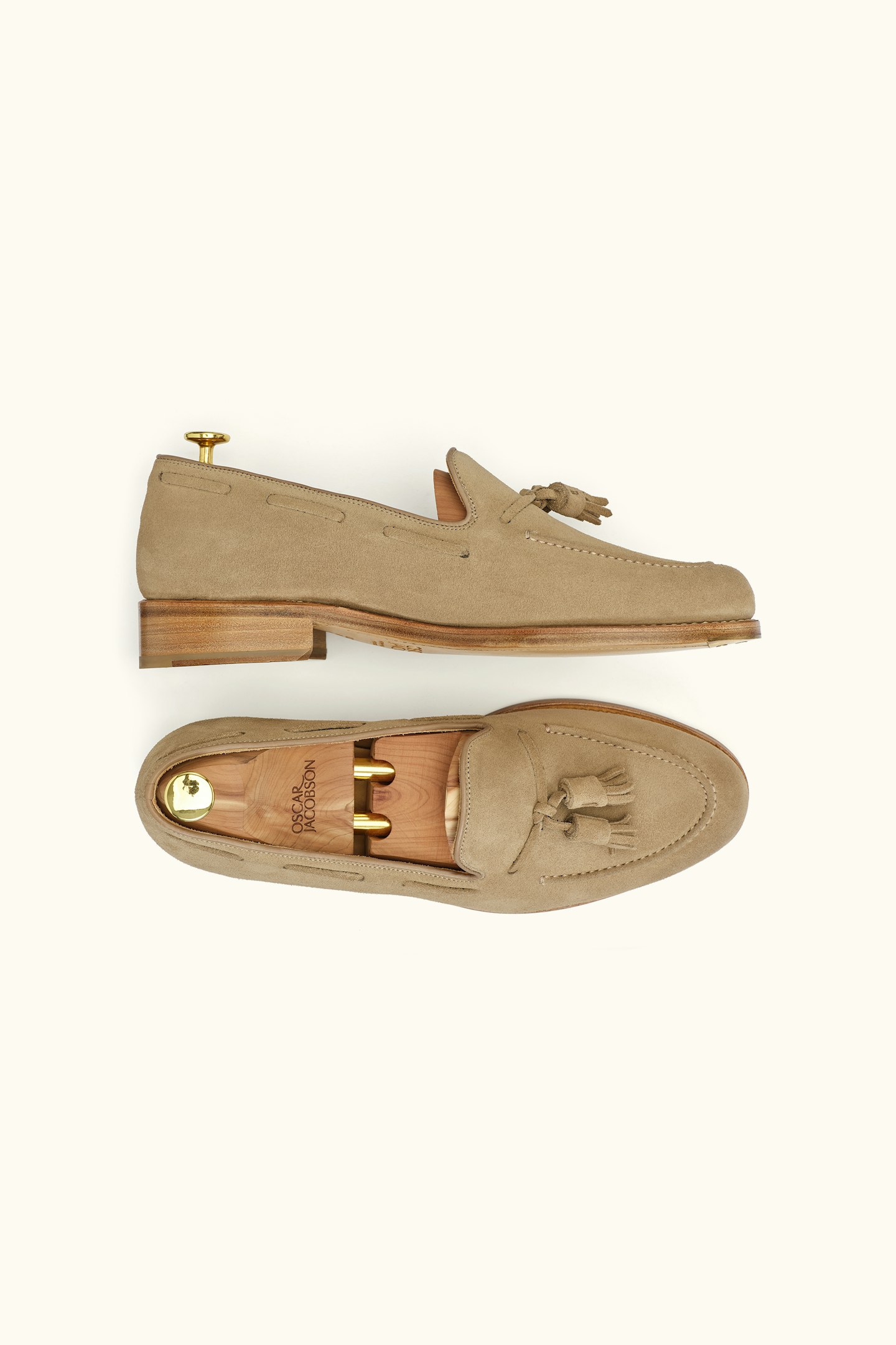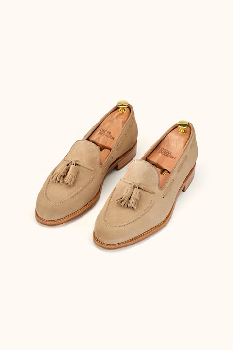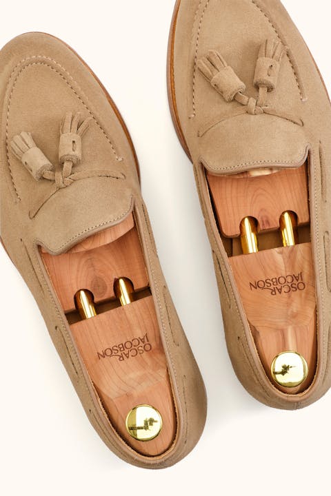 Goodyear-randsydde Tassel Loafers i eksklusivt semsket skinn, som former seg etter foten for optimal passform. Håndlagde i Spania med en vegetabilsk garvet skinnsåle, forsterket med et tåjern i messing for lengre holdbarhet. Innersålen er utstyrt med mykt, dempende memory foam, som tilpasser seg fotens konturer for størst mulig komfort. Den robuste konstruksjonen gjør at man kan bytte såler på skoene etter behov, noe som gir skoene lengre liv. Med vår nye binnsåle i skinn er skoene enda mer slitesterke og tåler flere sålebytter. En investering i tidløs kvalitet og holdbarhet.
