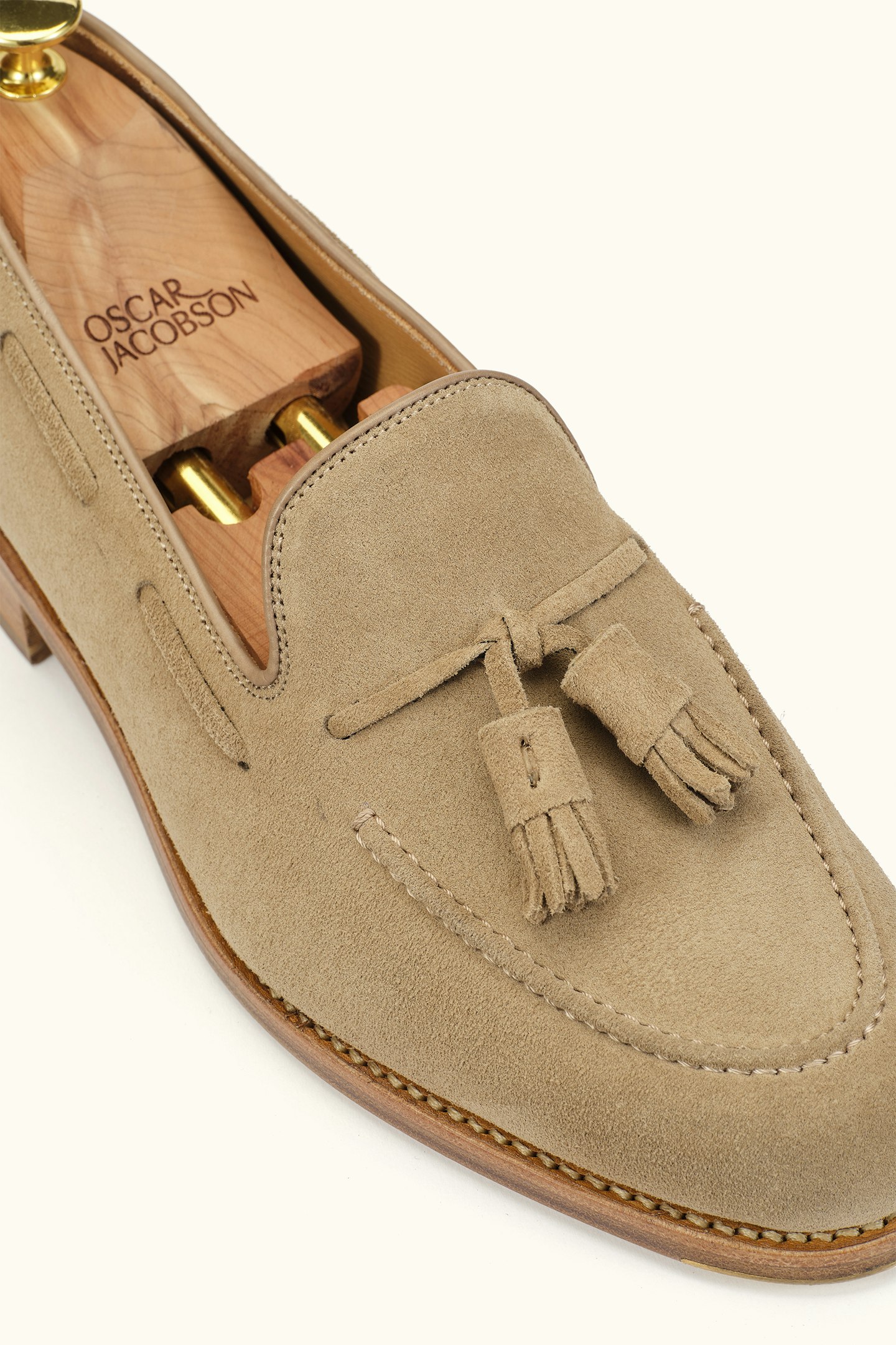 Goodyear-randsydde Tassel Loafers i eksklusivt semsket skinn, som former seg etter foten for optimal passform. Håndlagde i Spania med en vegetabilsk garvet skinnsåle, forsterket med et tåjern i messing for lengre holdbarhet. Innersålen er utstyrt med mykt, dempende memory foam, som tilpasser seg fotens konturer for størst mulig komfort. Den robuste konstruksjonen gjør at man kan bytte såler på skoene etter behov, noe som gir skoene lengre liv. Med vår nye binnsåle i skinn er skoene enda mer slitesterke og tåler flere sålebytter. En investering i tidløs kvalitet og holdbarhet.