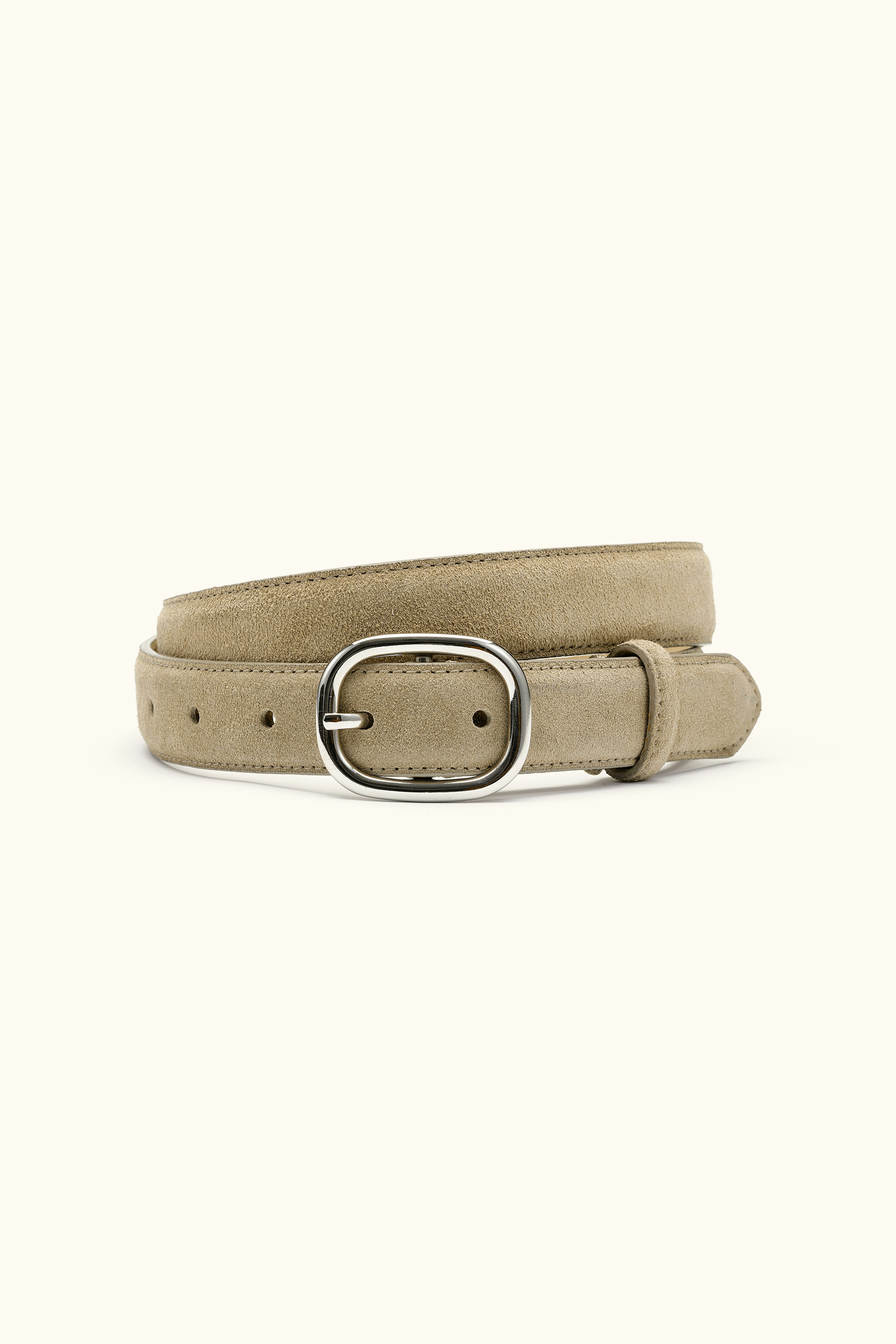 Bälte i en italiensk finfibrig mocka med ovalt spänne. Bältet är 2,5 cm bred.