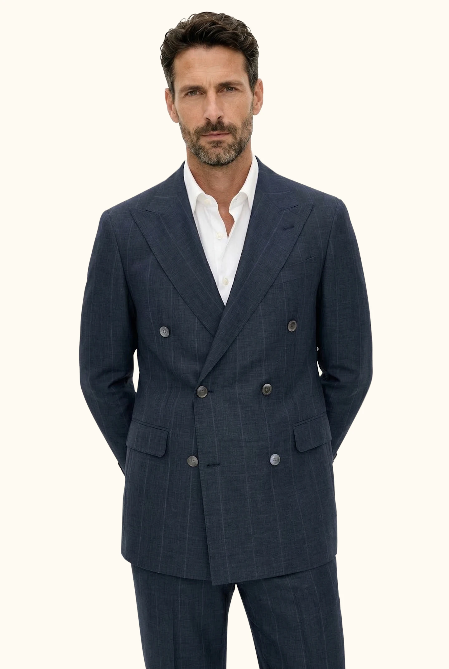 Kavaj Richard är dubbelknäppt och utformad som del av en kostym. Tyget från Lanificio Zegna är vävt i en twillstruktur med subtil rand, där ull, linne och silke samverkar för att ge stadga, textur och en lätt lyster. Silhuetten är balanserad med något bredare axlar och spetsiga slag. Konstruktionen är uppbyggd med fokus på fall och proportion, med detaljer som stödjer modellens form och följsamhet.