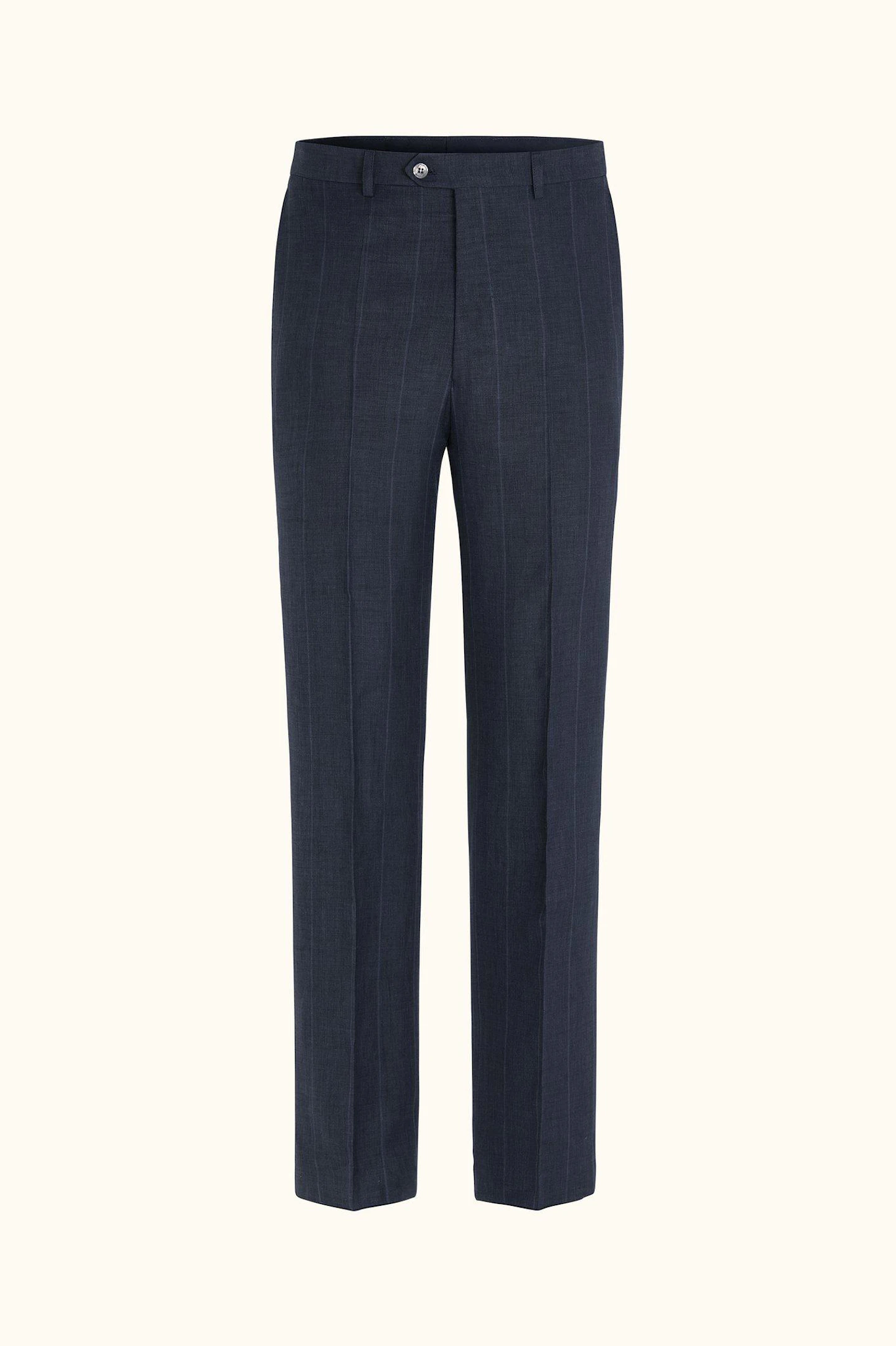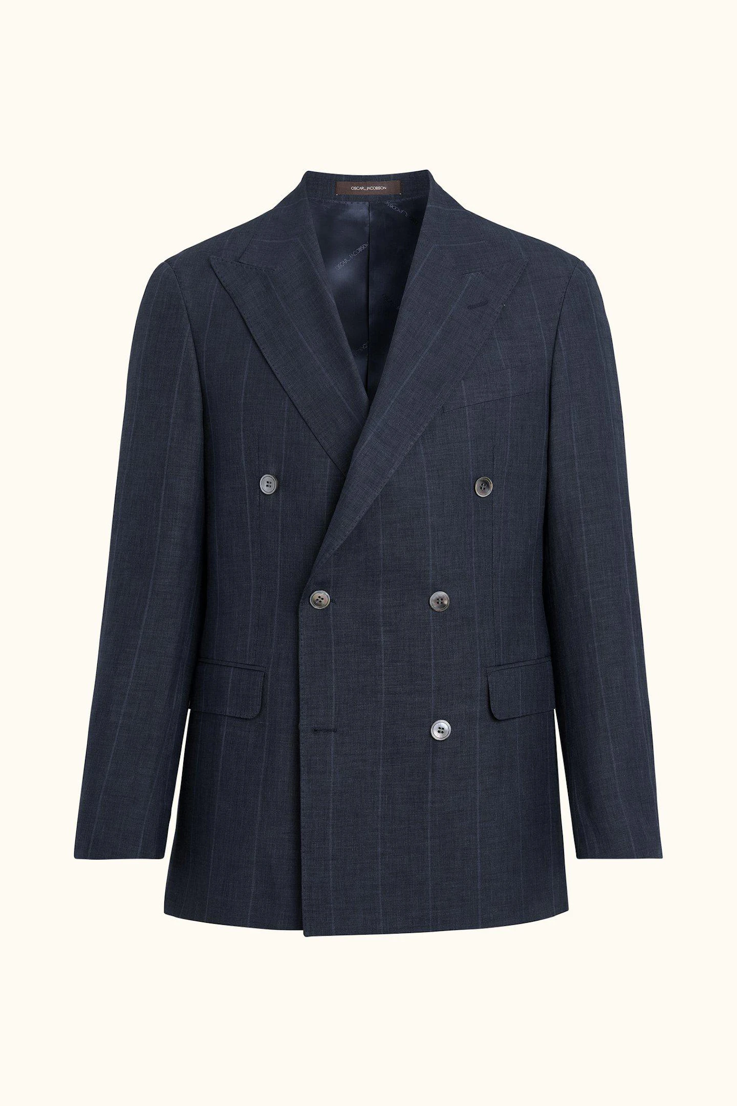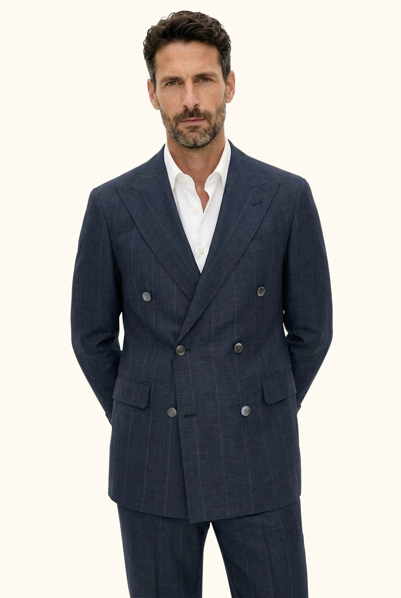 En dubbelknäppt kostym i tyg från Lanificio Zegna som är vävt i en twillstruktur med subtila ränder, där ull, linne och siden samverkar för att ge stabilitet, textur och en lätt lyster. Silhuetten är balanserad med något bredare axlar och spetsiga slag, vilket skapar ett självsäkert och sofistikerat uttryck. Byxorna är skurna i regular fit och kompletterar kavajen med en ren och mångsidig linje. Konstruktionen är utvecklad med fokus på fall och proportioner, med detaljer som framhäver tygets naturliga form och rörelse.
