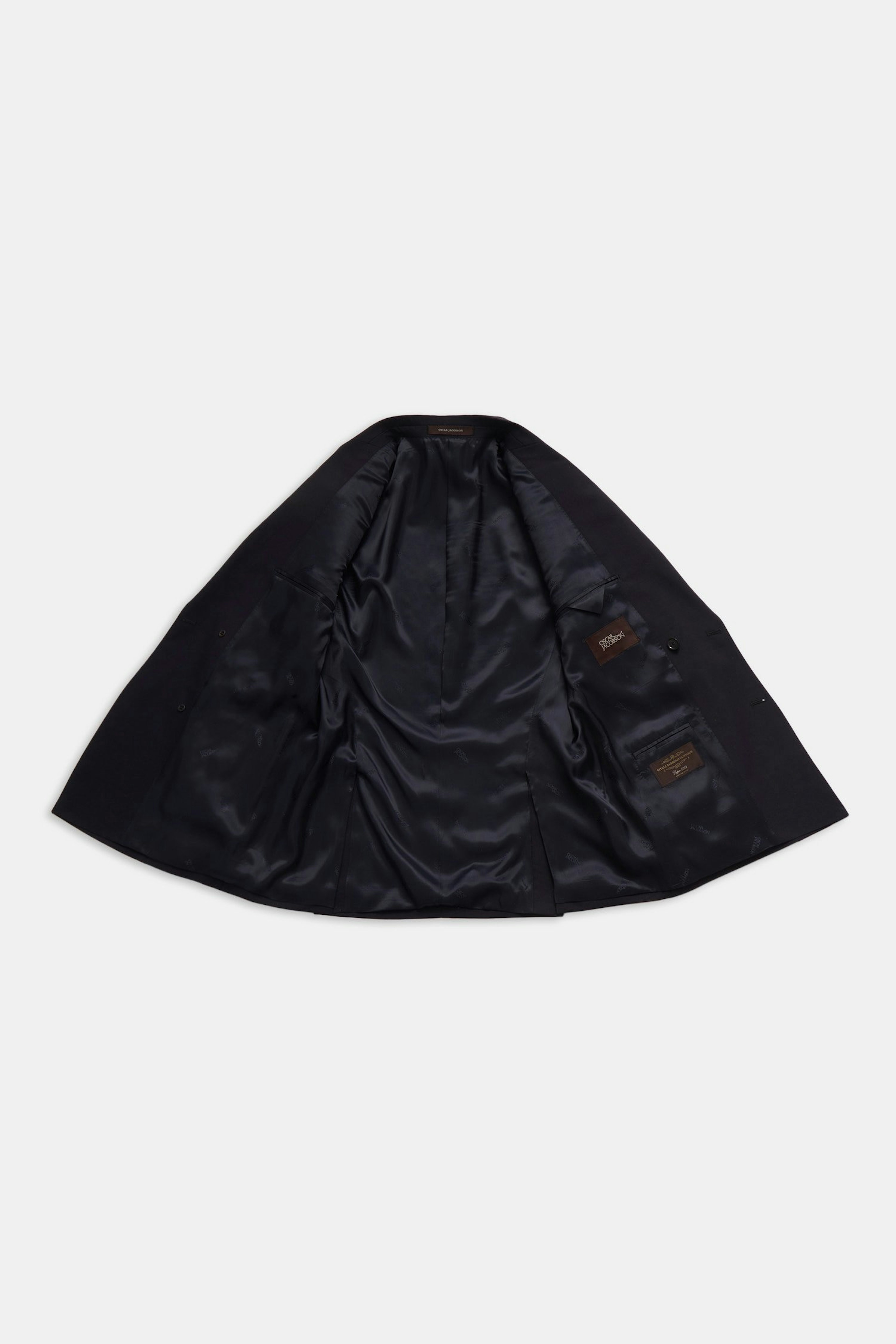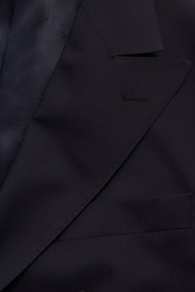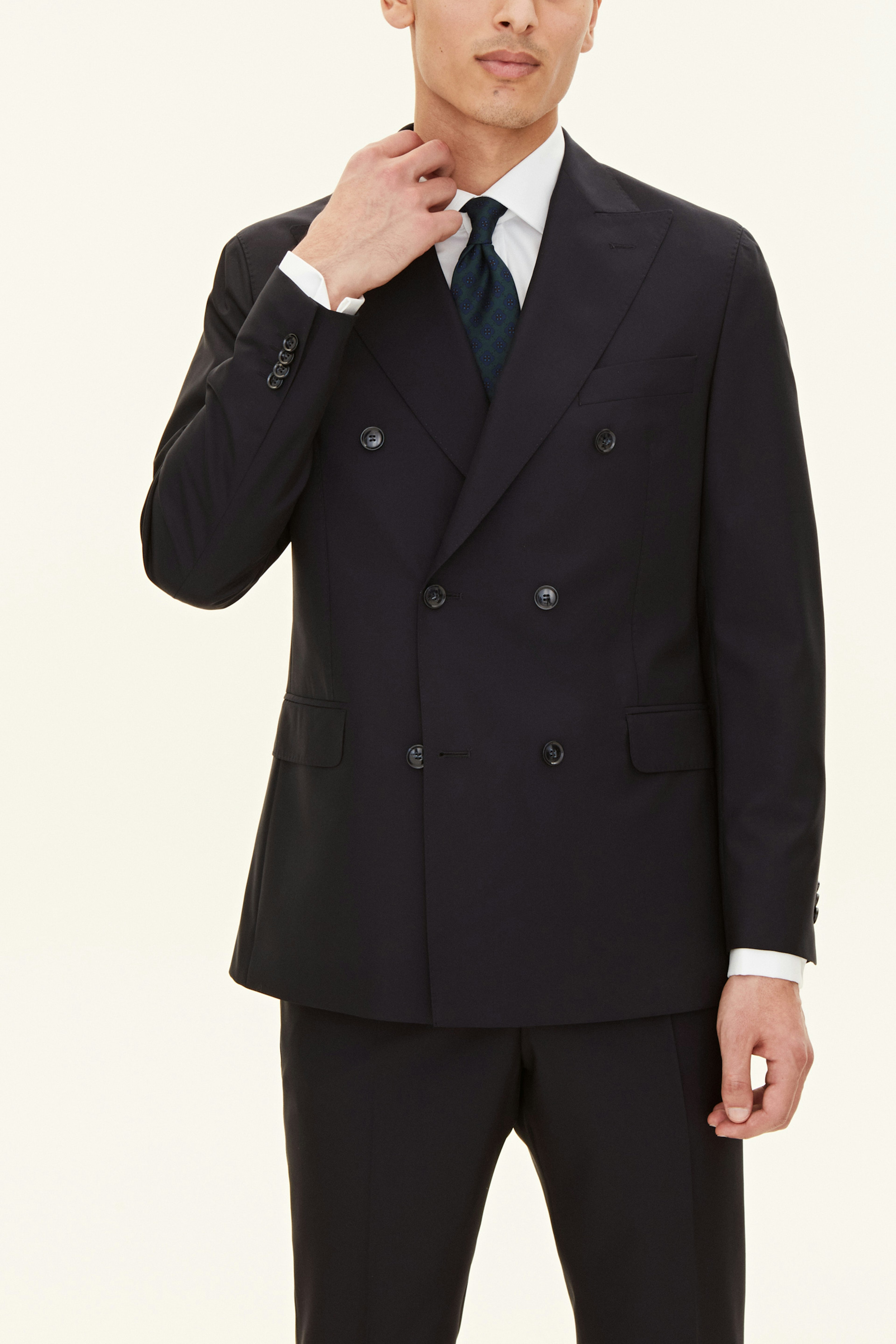 Klassisk dubbelknäppt kavaj i normal passform med spetsiga slag och mjuk konstruerad axel. Tillverkad i slät Super 120’S ull.