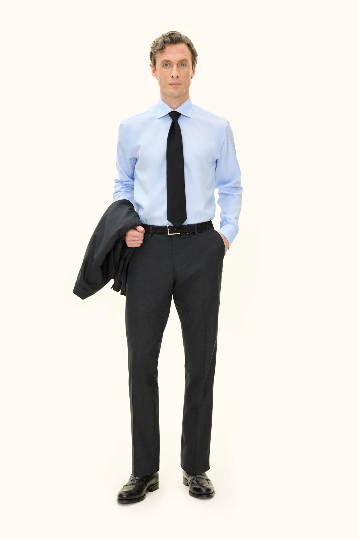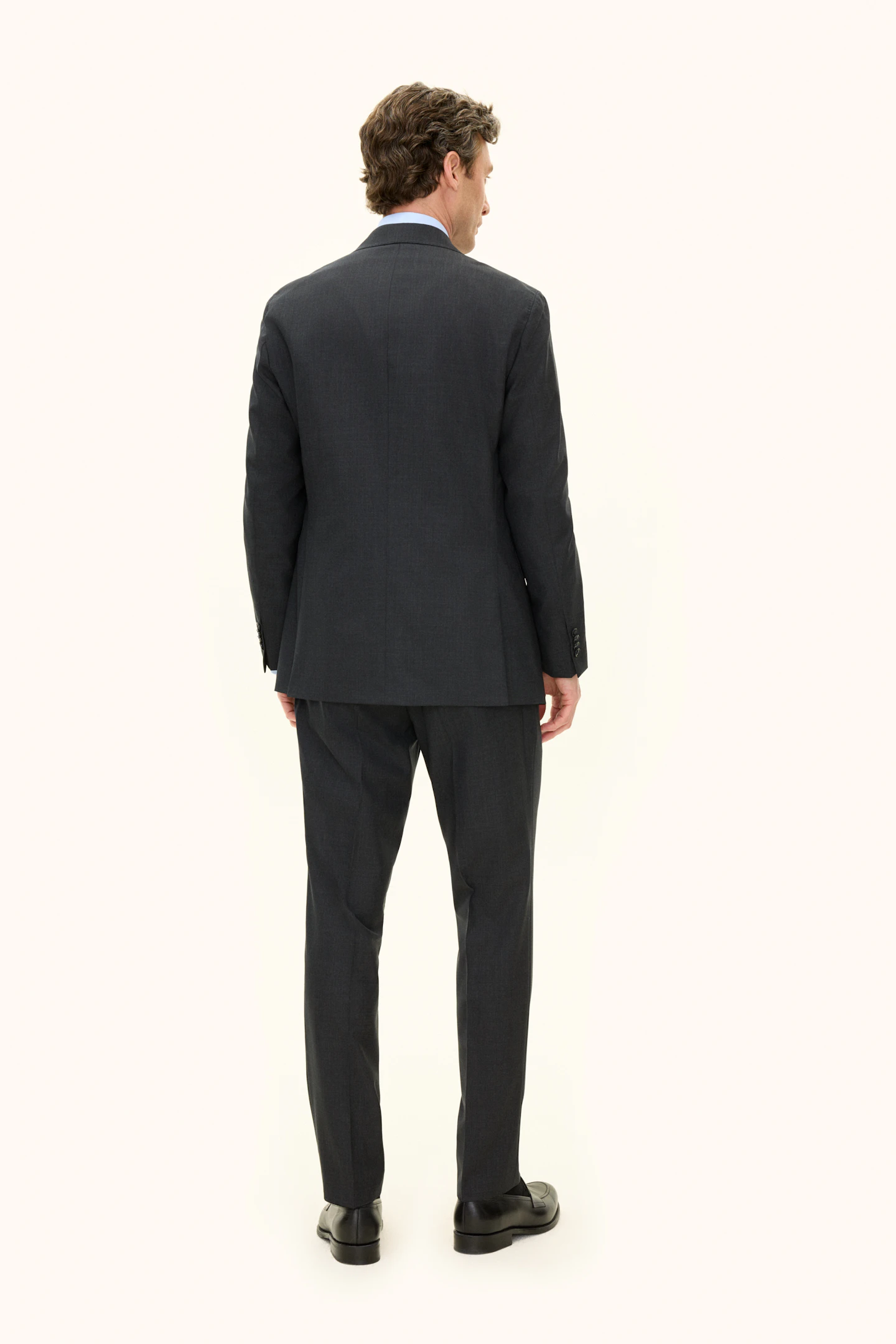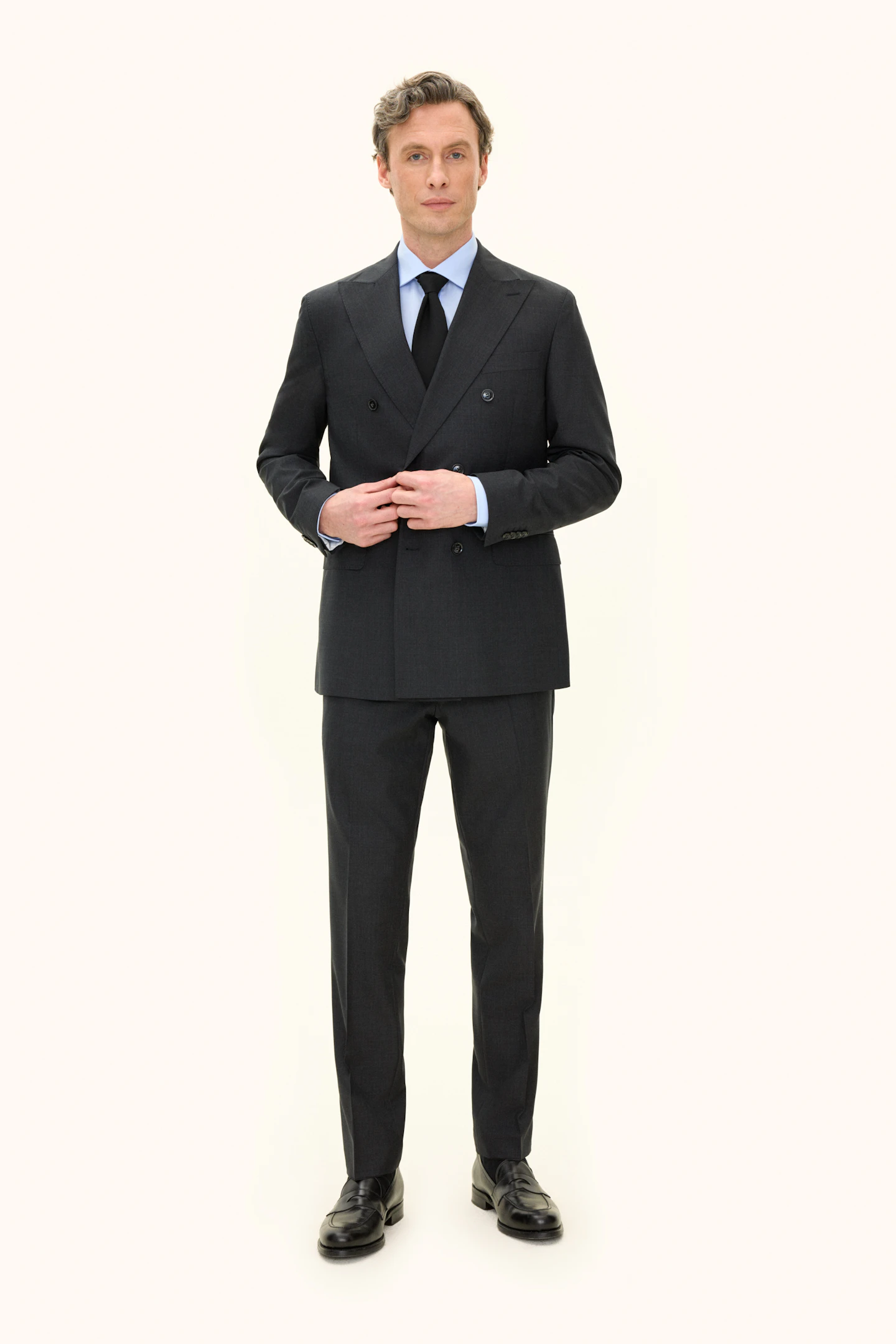 Klassisk dubbelknäppt kostym i regular fit med spetsiga slag och mjuk konstruerad axel. Tillverkad i slät Super 120’S ull från väveriet Vitale Barberis Canonico. Byxan har en klassisk passform som smalnar av mot foten och en klassisk byxlängd som precis nuddar skon.