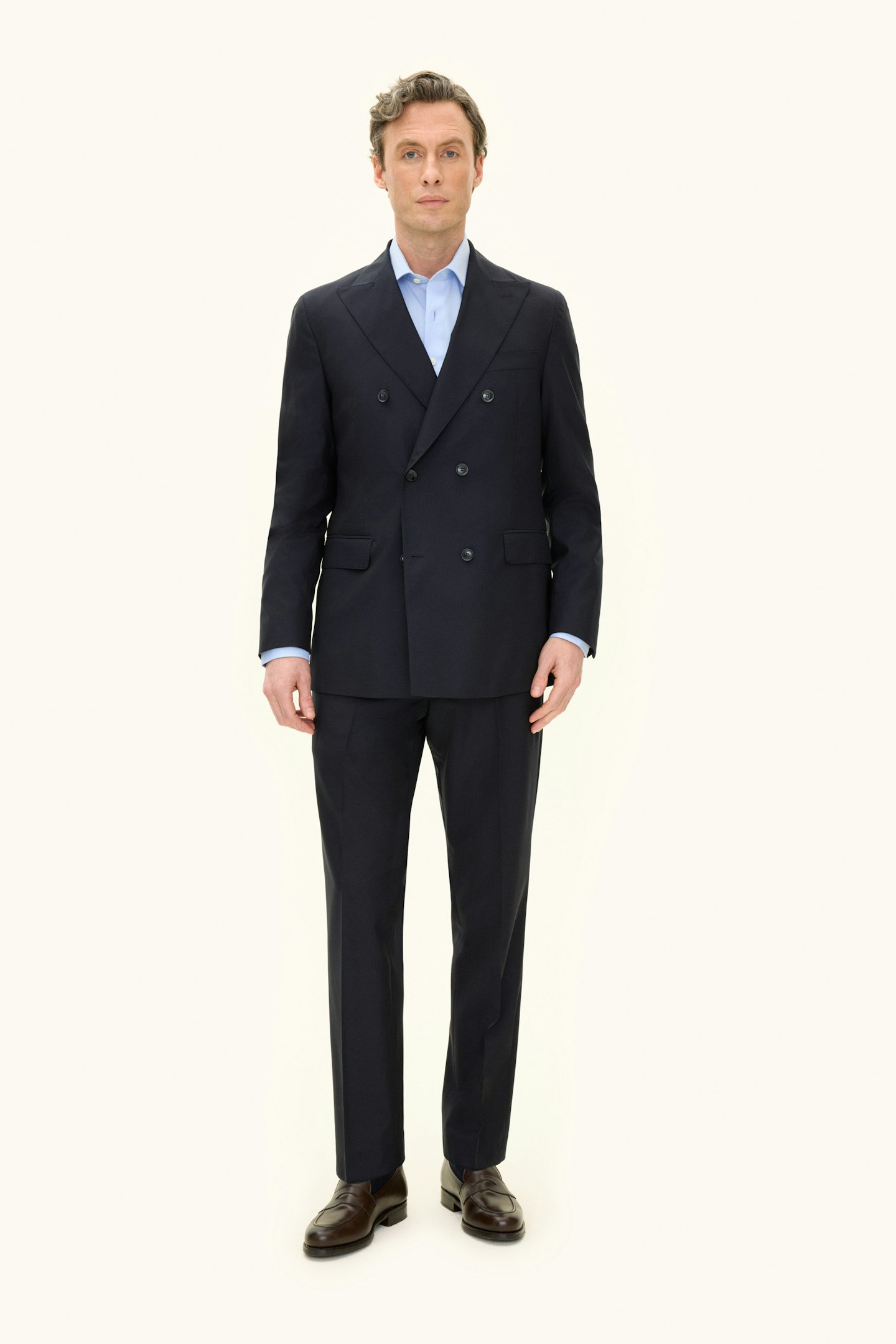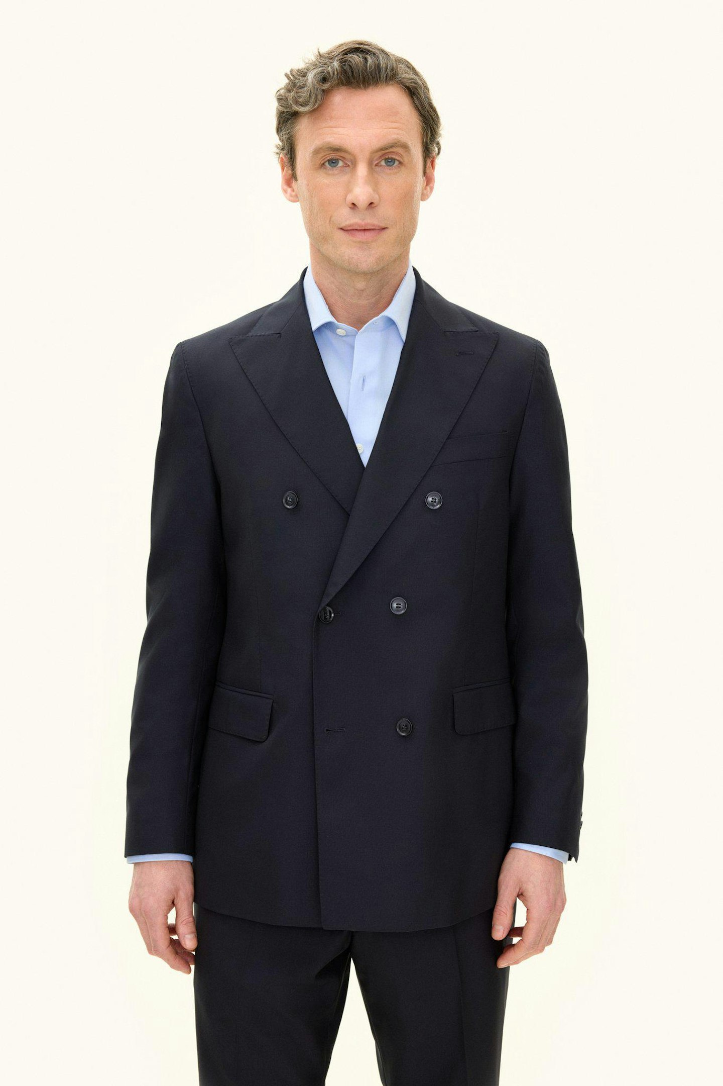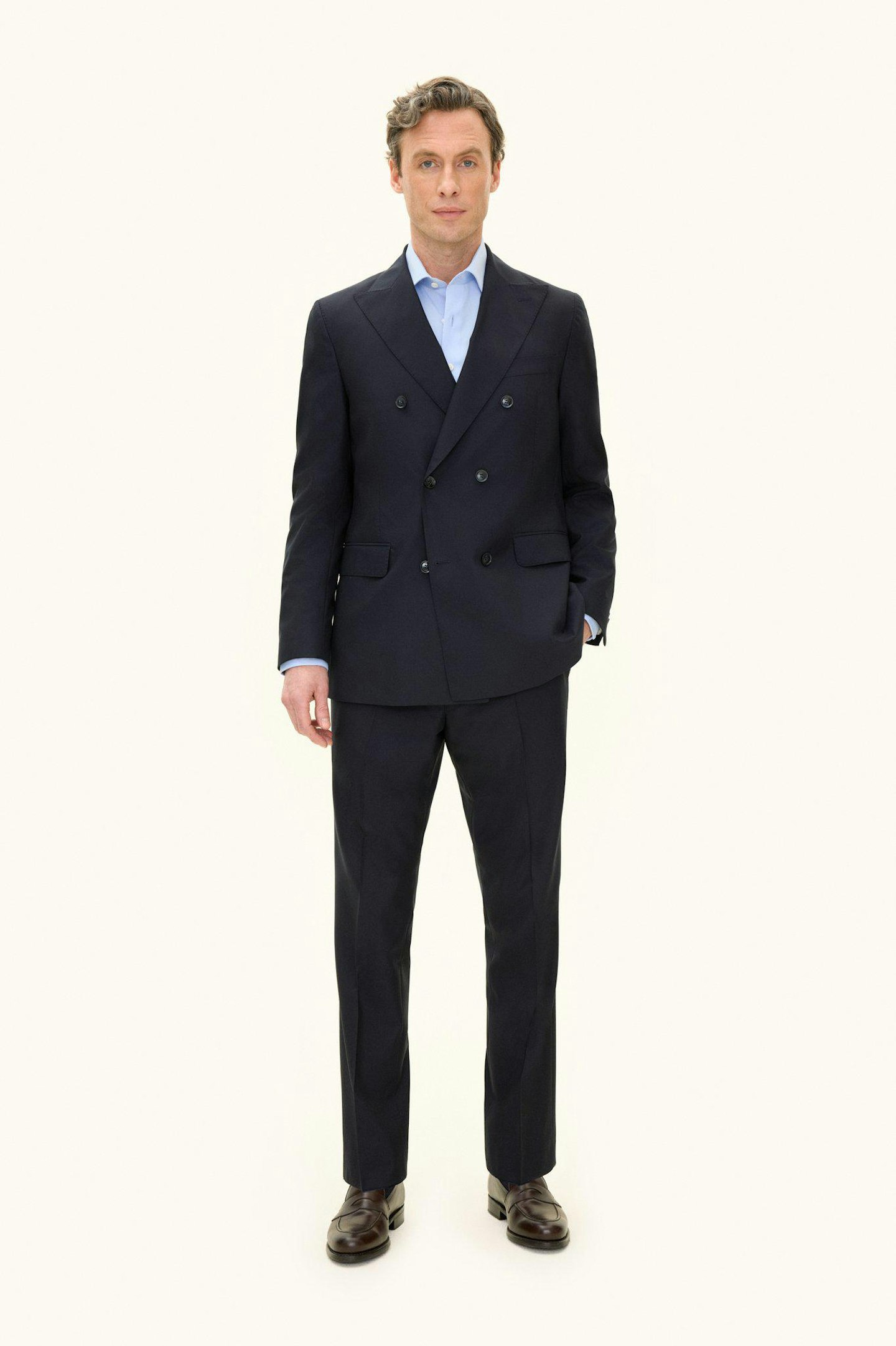 Klassisk dubbelknäppt kostym i regular fit med spetsiga slag och mjuk konstruerad axel. Tillverkad i slät Super 120’S ull från väveriet Vitale Barberis Canonico. Byxan har en klassisk passform som smalnar av mot foten och en klassisk byxlängd som precis nuddar skon.