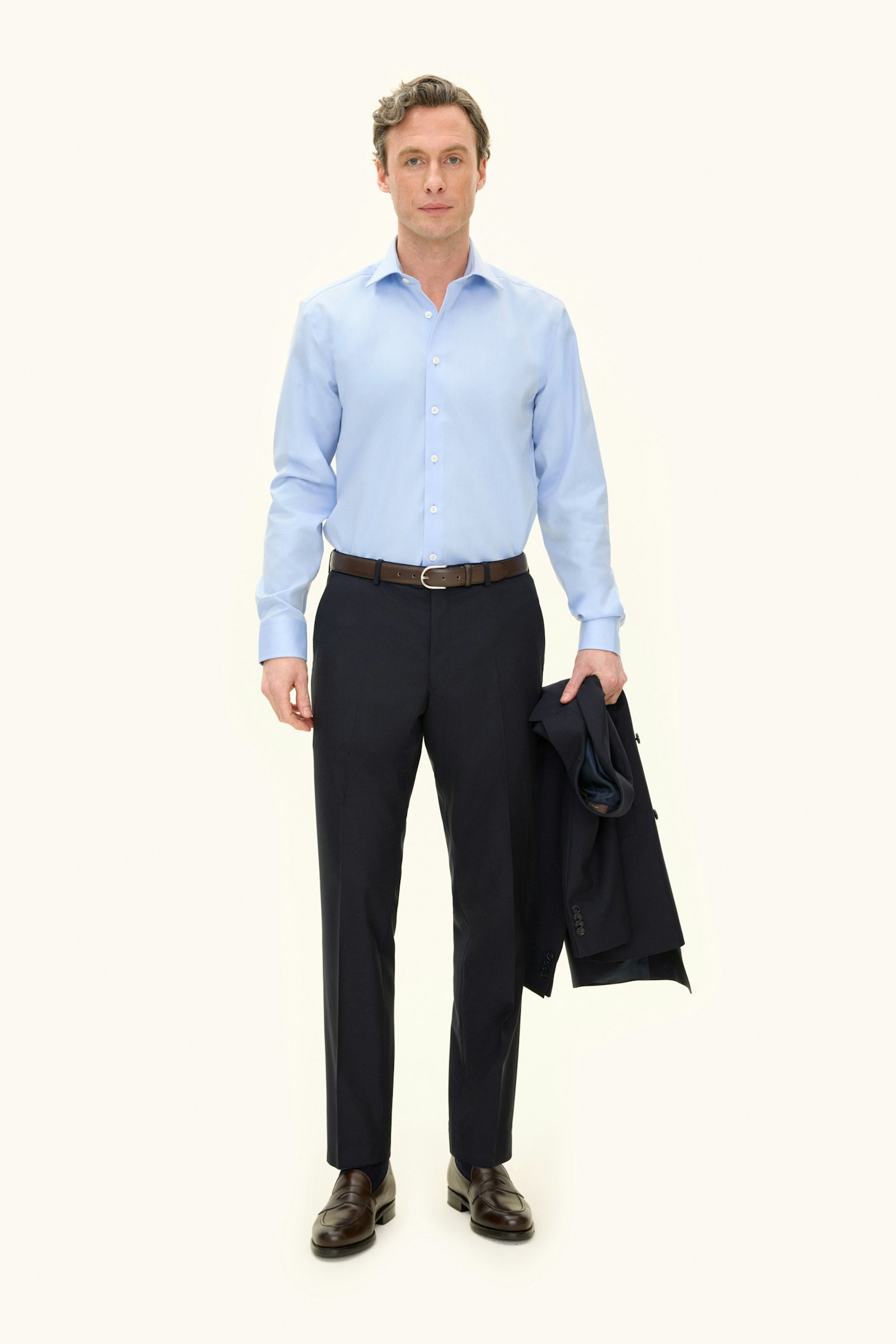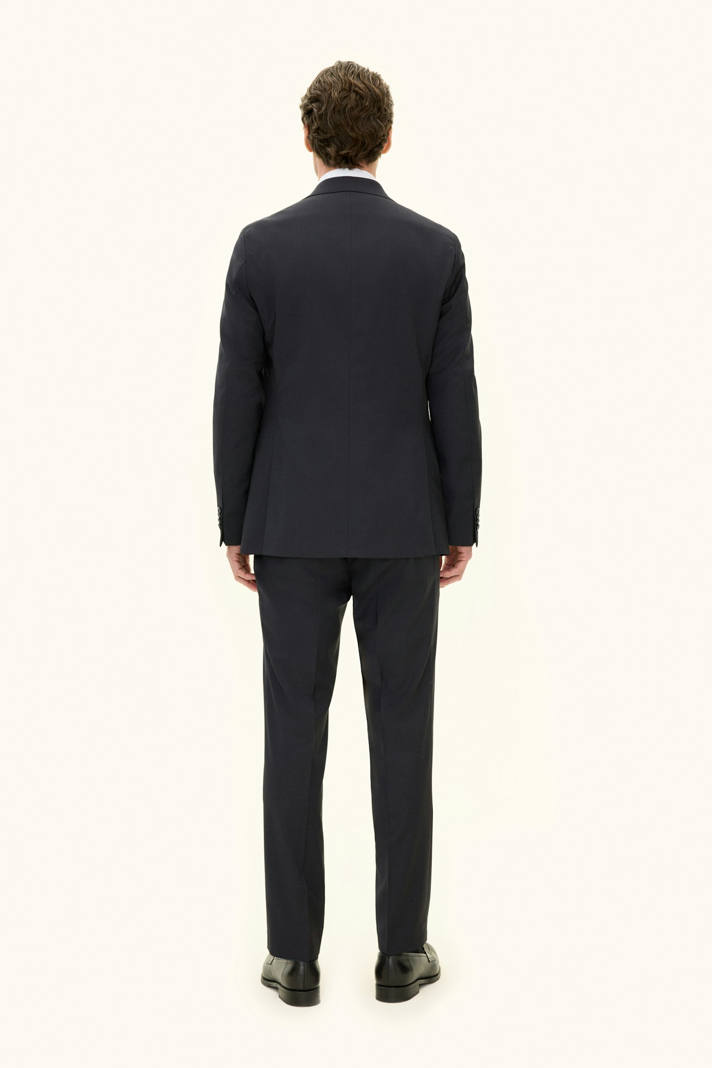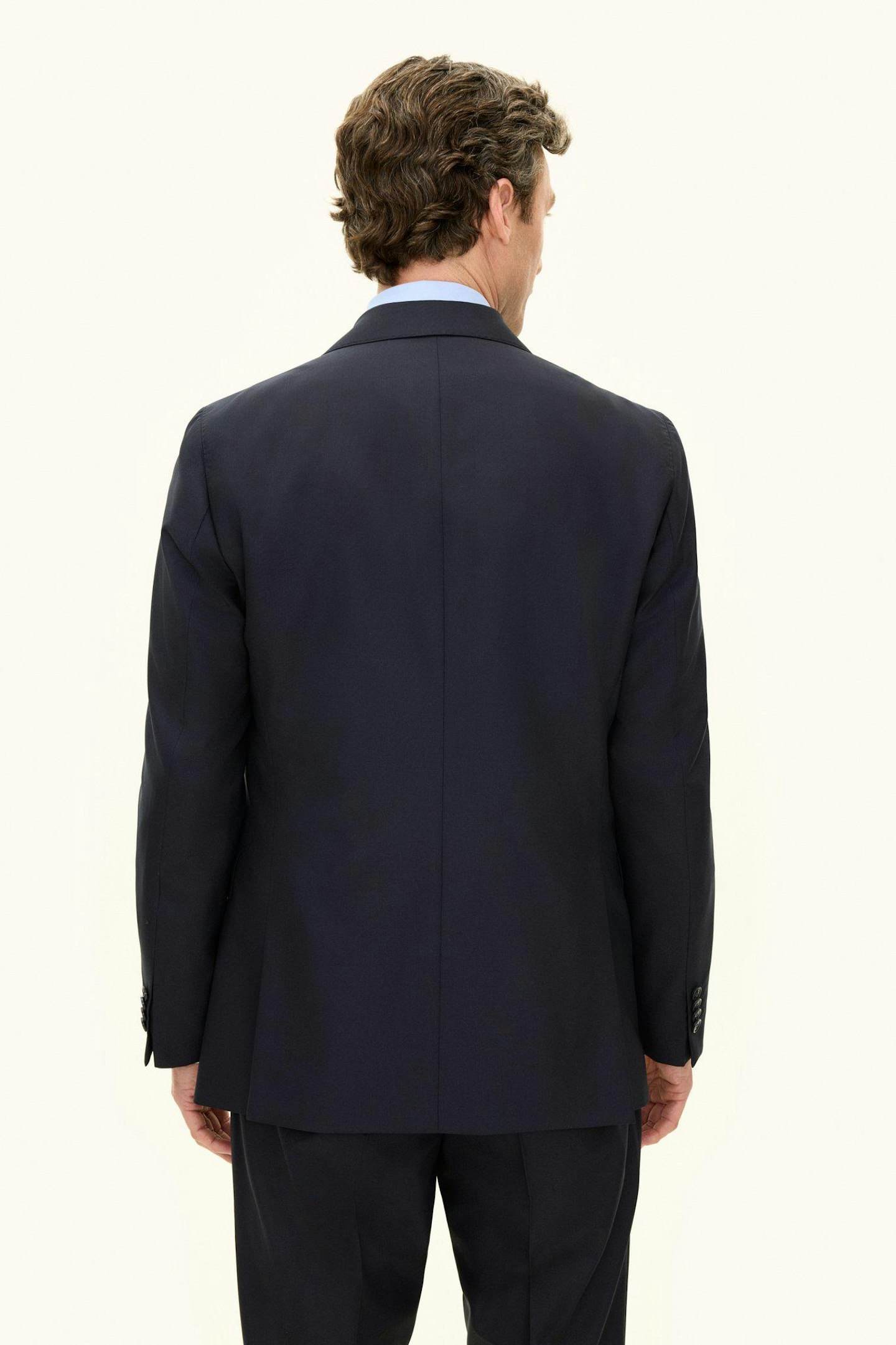 Klassisk dubbelknäppt kostym i regular fit med spetsiga slag och mjuk konstruerad axel. Tillverkad i slät Super 120’S ull från väveriet Vitale Barberis Canonico. Byxan har en klassisk passform som smalnar av mot foten och en klassisk byxlängd som precis nuddar skon.
