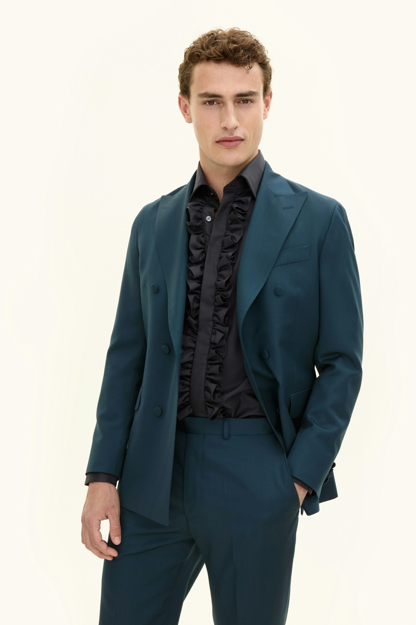 Detta plagg är noggrant tillverkat för att säkerställa både komfort och hållbarhet. Tillverkad av 100% ull, har denna kavaj en regular fit. Den har en dubbelknäppt stängning. Ett essentiellt plagg som förkroppsligar klassisk stil.