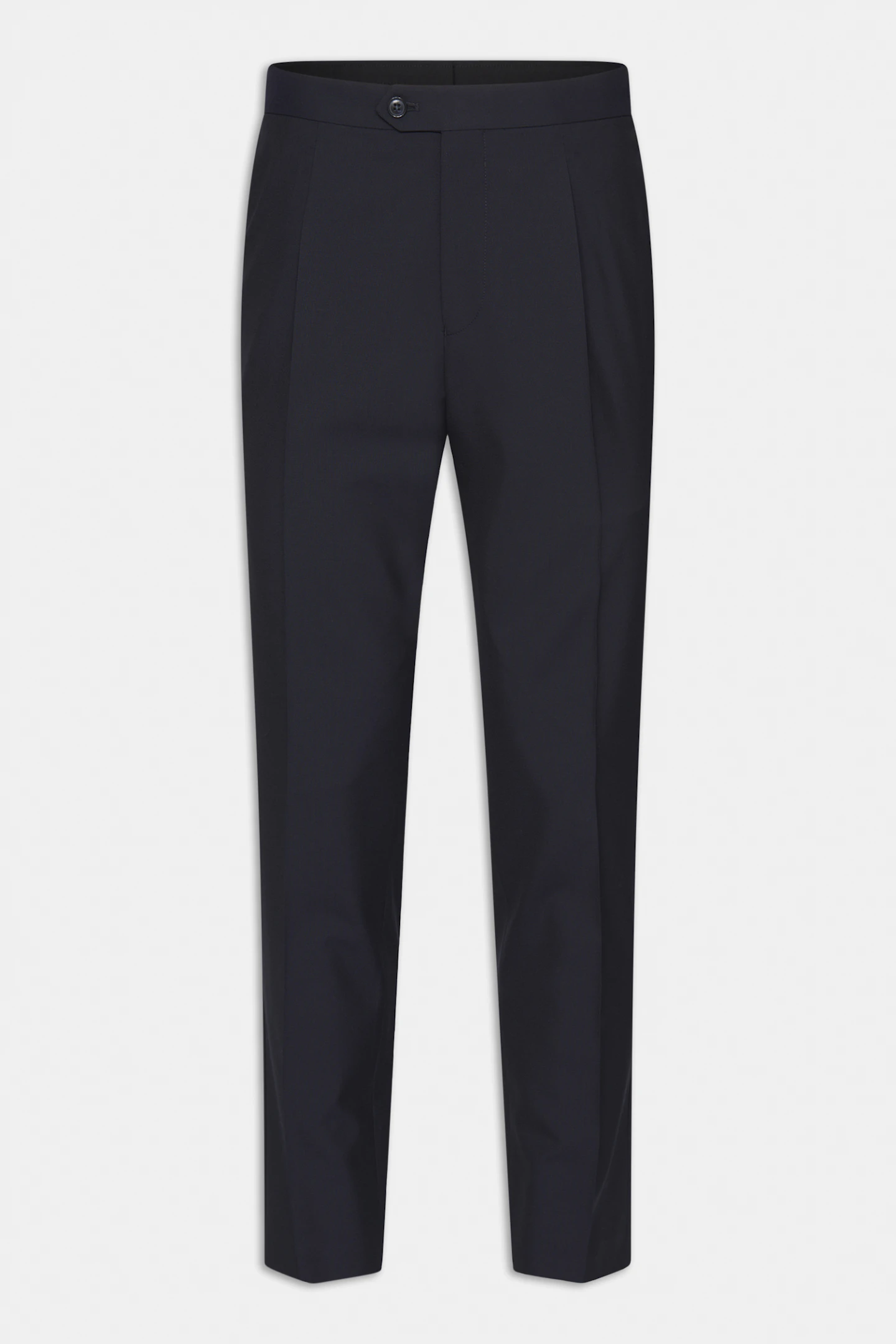 En av våra favoritbyxor med hög midja och frontveck, även försedda med eleganta sidospännen. Tillverkade i italiensk super 120’s ull från väveriet Vitale Barberis Canonico.