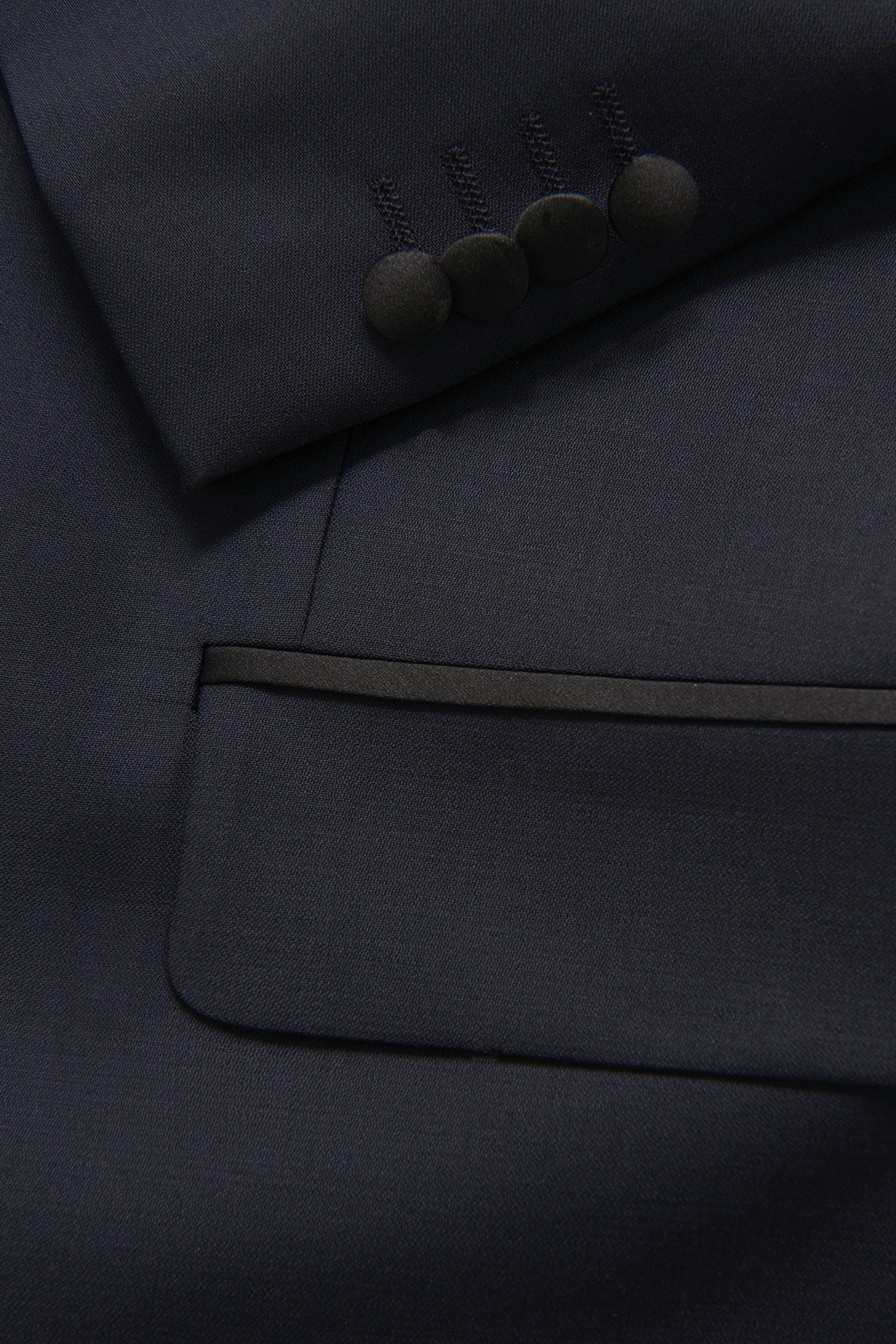 Klassisk smoking med spetsiga sidenslag. Normal passform - figursydd med lite mer utrymme. Klassisk konstruktion med väldefinierade linjer. Helfodrad insida i viskos för komfort och känsla. Sidenpasspoalerade fickor - ett självklart val för extra festliga tillfällen. Längd från nacke till kavajslut i storlek 50: 75 cm.
