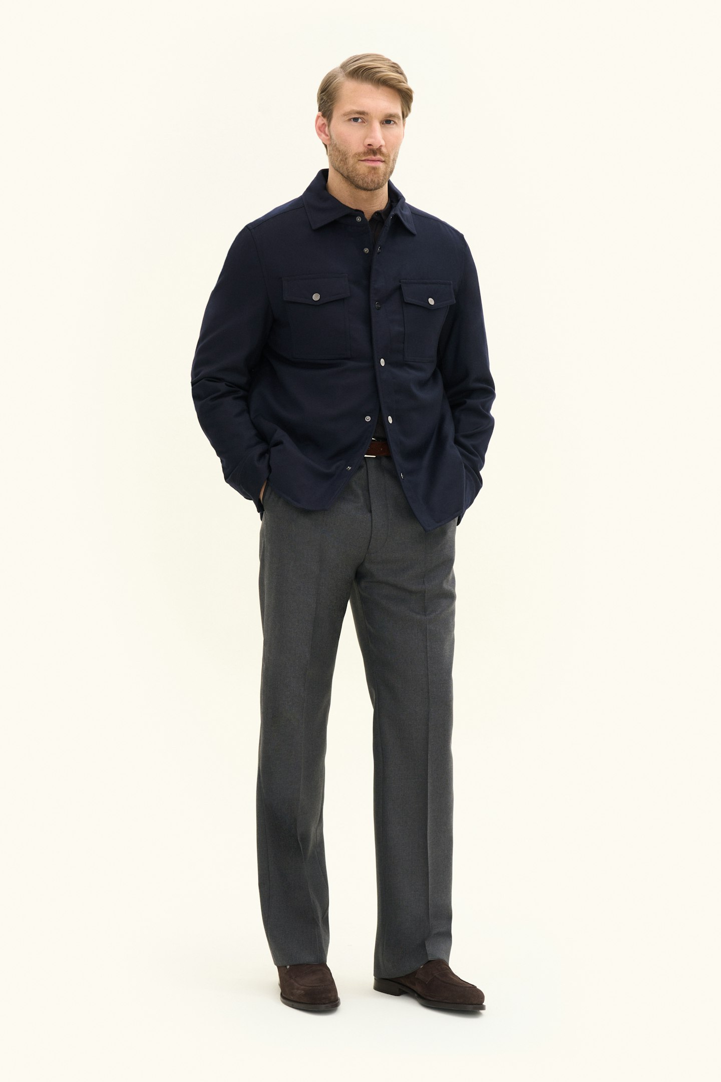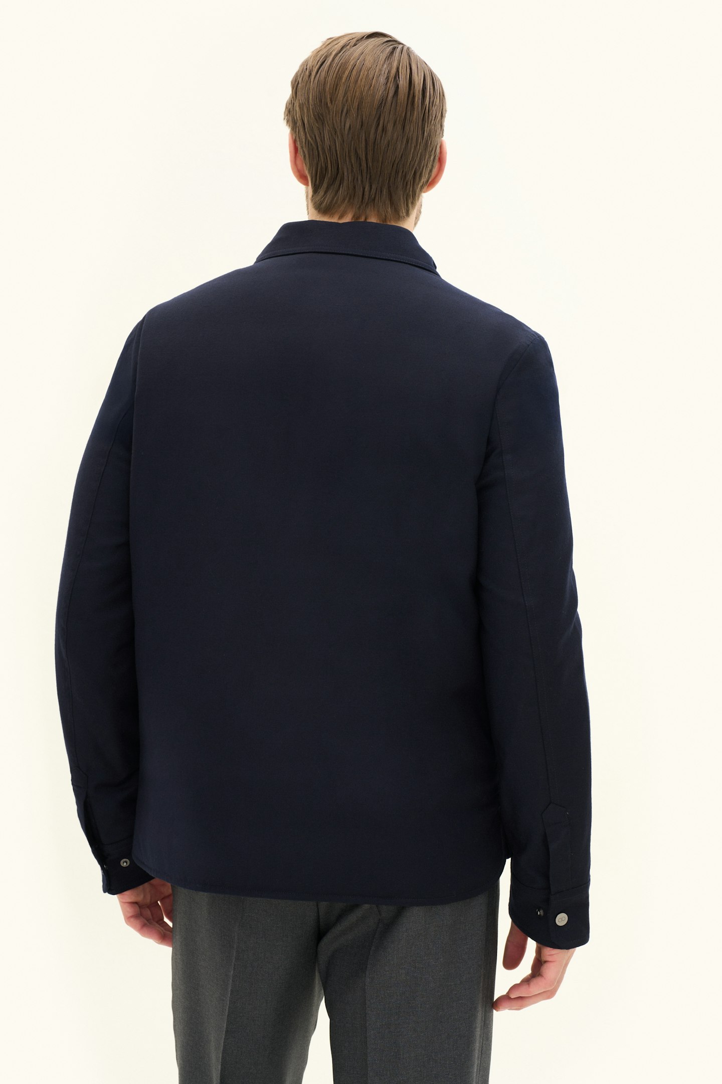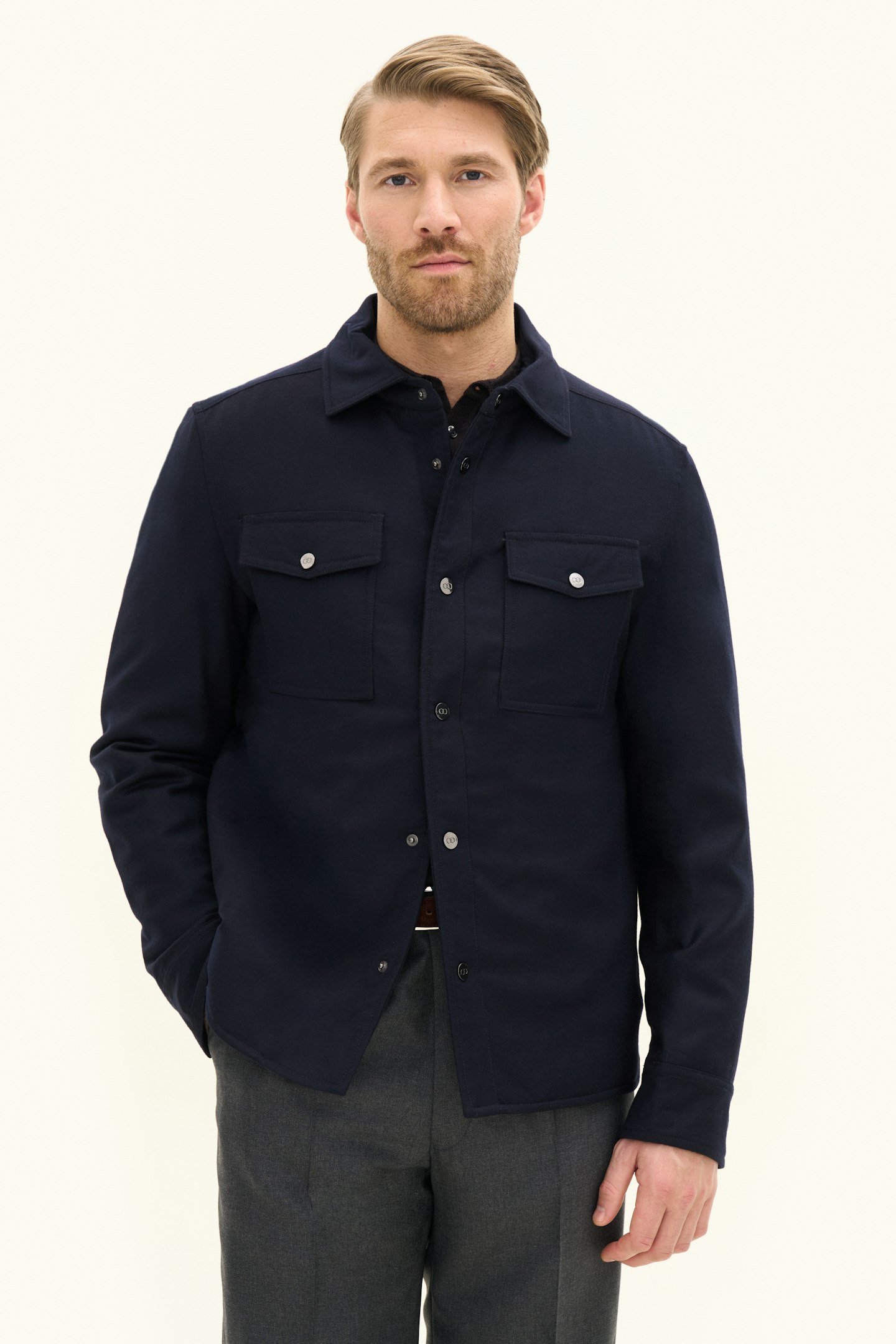 Tillverkad i en mjuk ullblandning och skuren i regular fit erbjuder denna overshirt en följsam känsla med bibehållen elegans. Det avskalade uttrycket gör den till ett självklart val för både vardag och mer uppklädda sammanhang