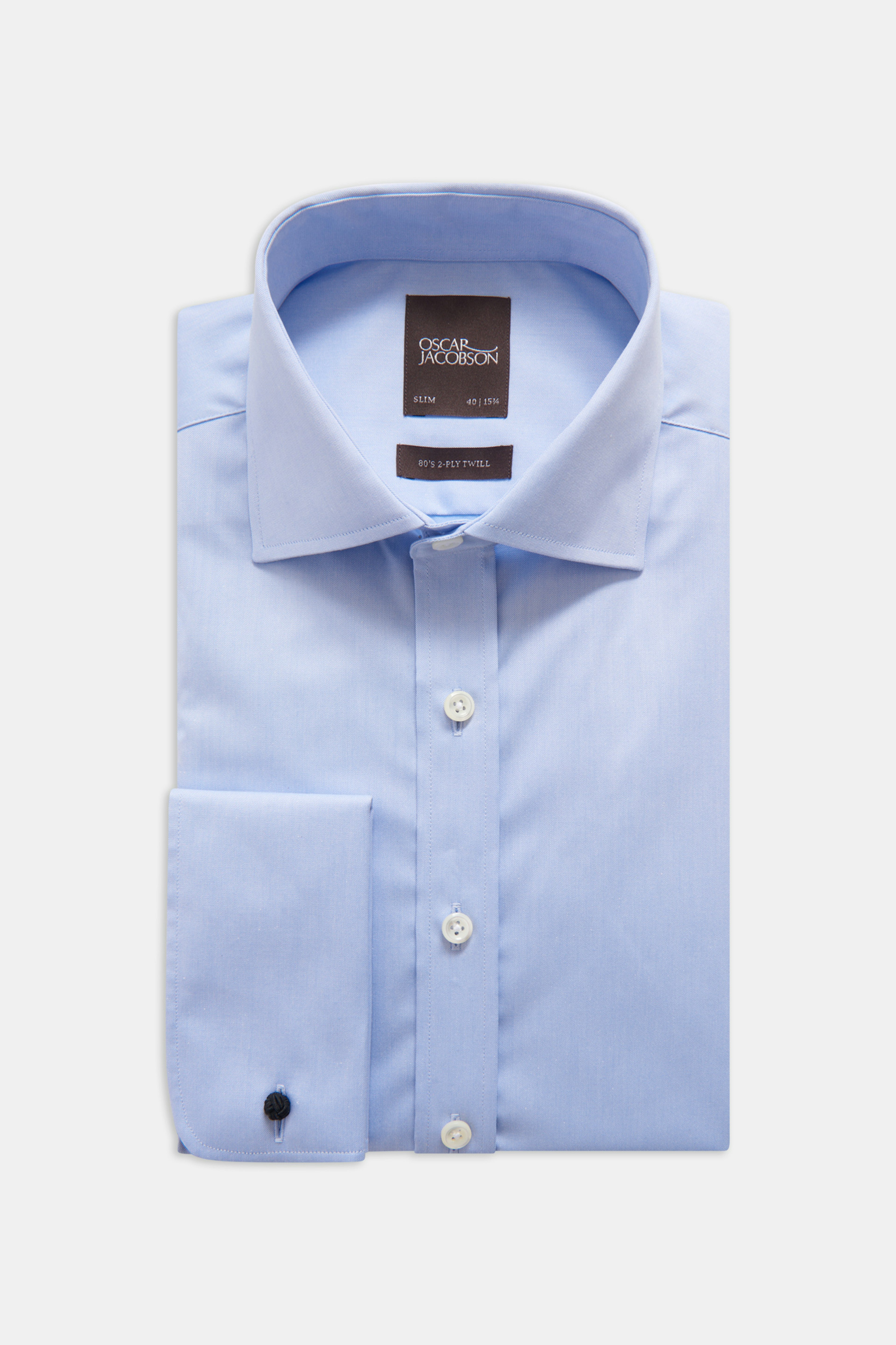 Businesskjorta i slim fit med dubbel manschett tillverkad i en mjuk och skrynkeltålig bomullstwill. Den eleganta semi cut away kragen gör sig utmärkt både med och utan slips.