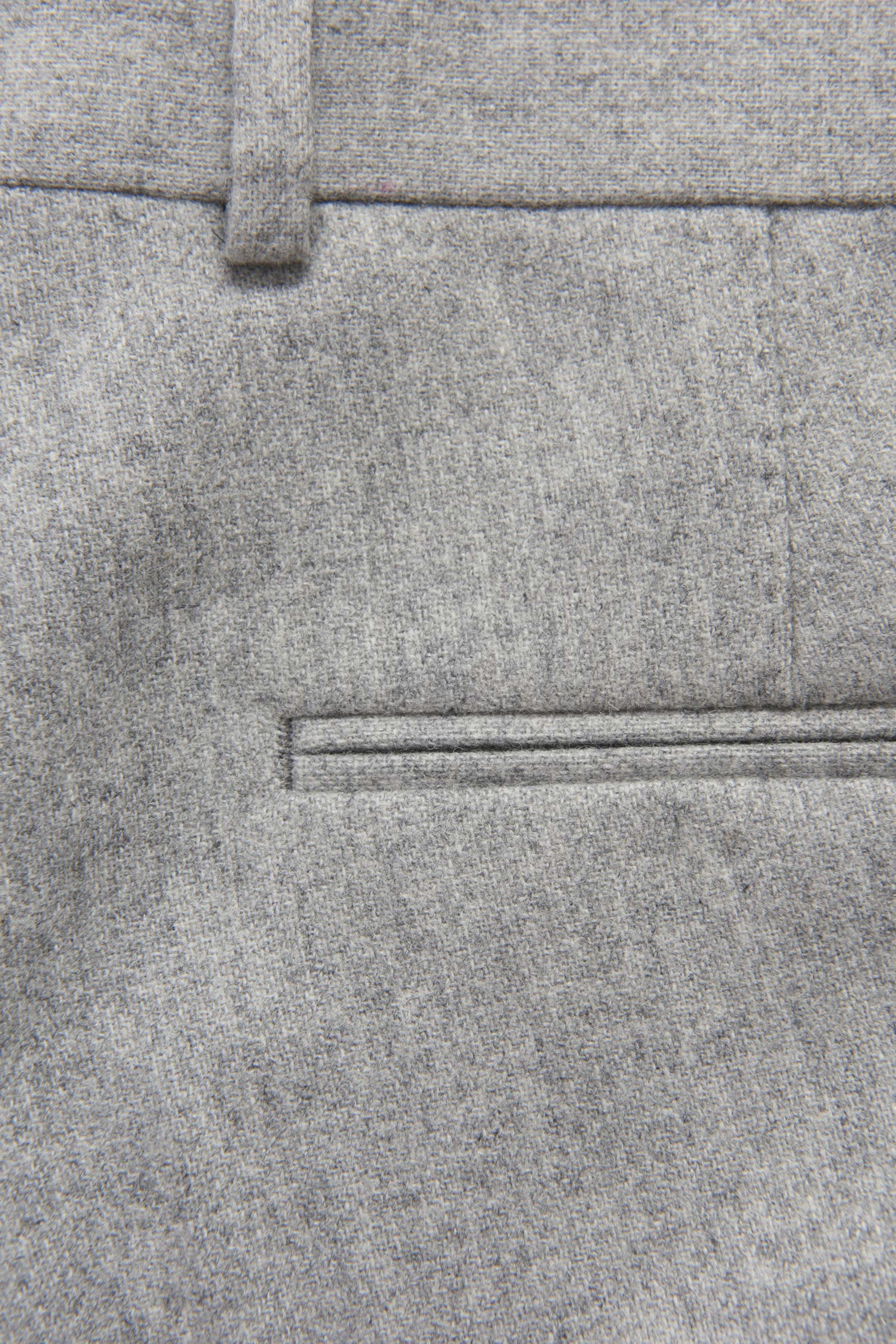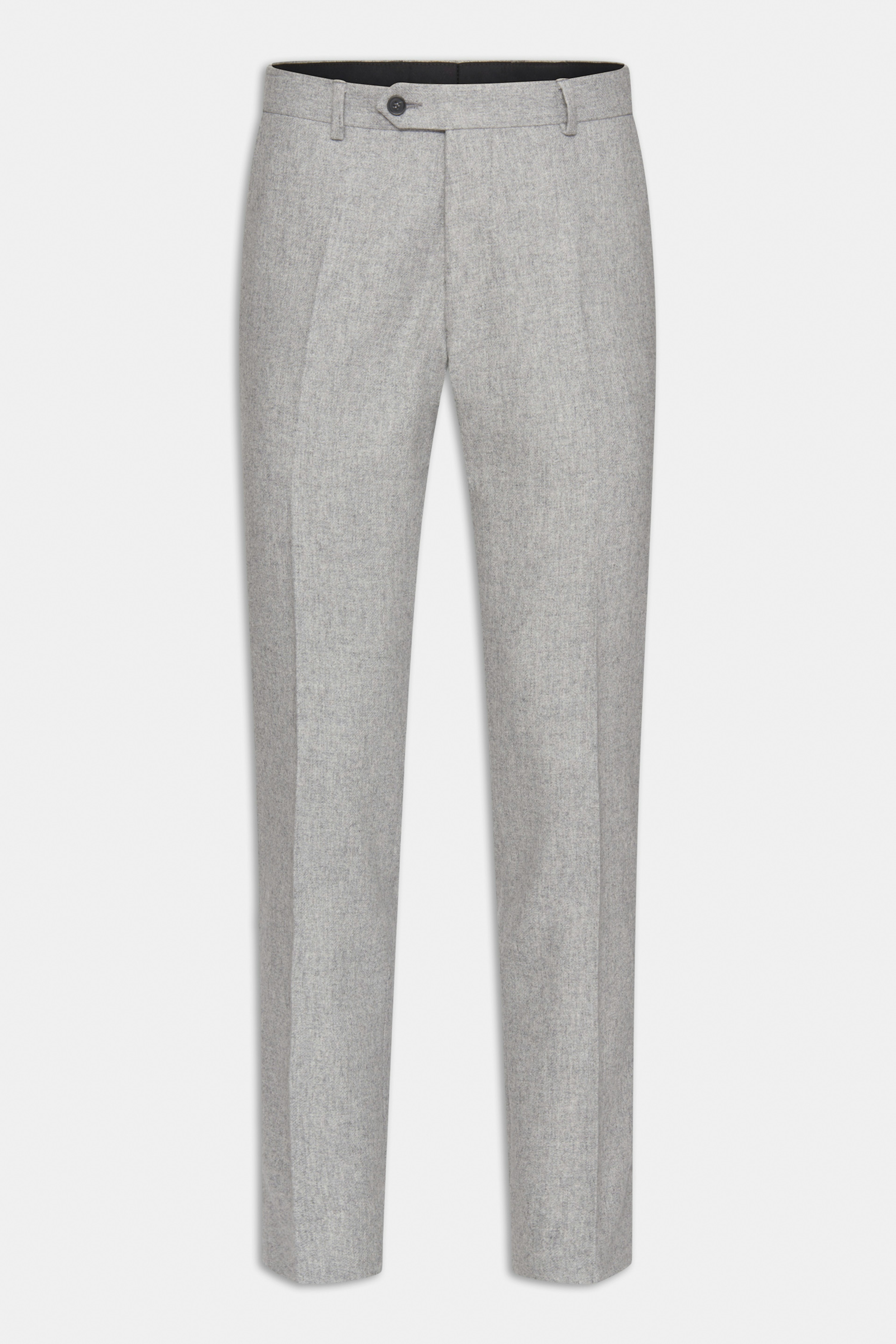 Flanellbyxor i melerad ullblandning. Byxorna har en smalt skuren passform, men en lätt tilltagen lårvidd för ökad komfort. Jämfört med den traditionella kostymbyxan har denna modell en aningen kortare benlängd vilket skapar ett snyggt fall utan bryt.