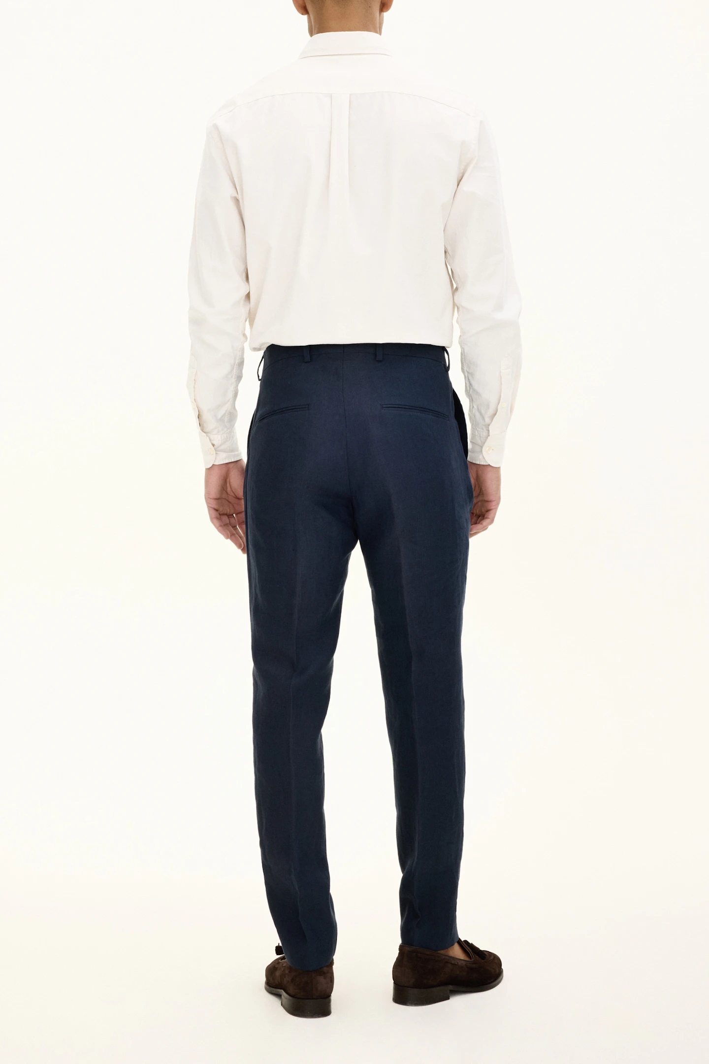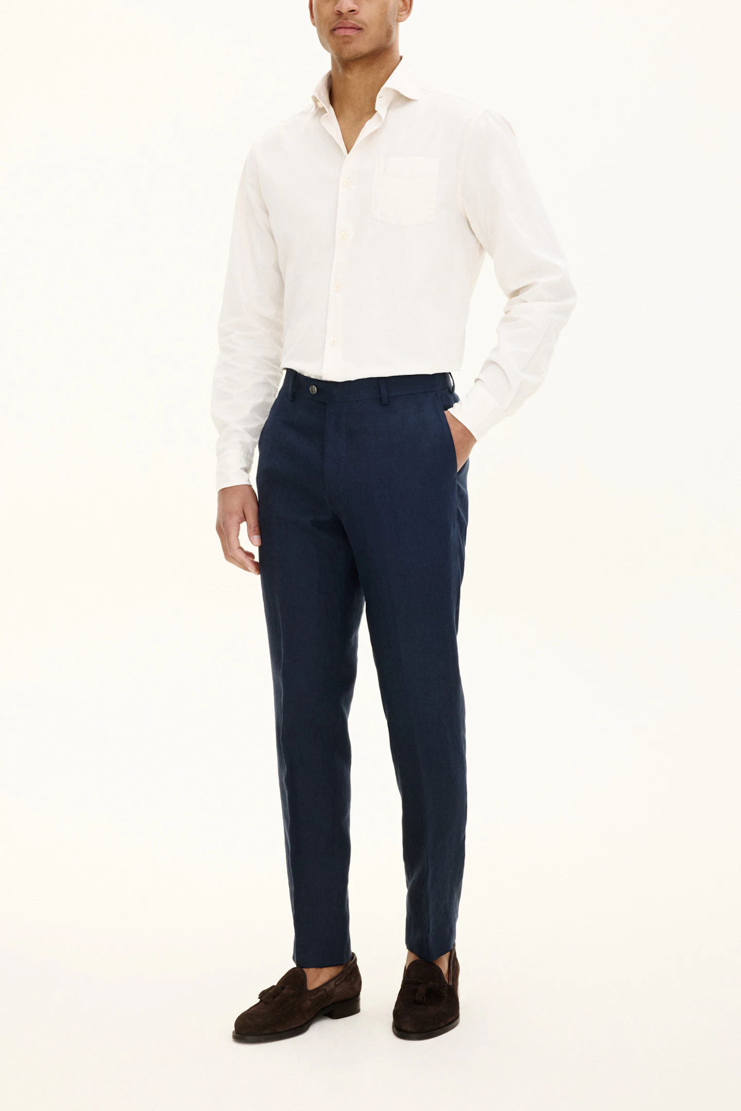 Byxa i en smal passform med normalhög midja, bälteshällor och avsmalnande ben. Tillverkad i ett tunt linnetyg.