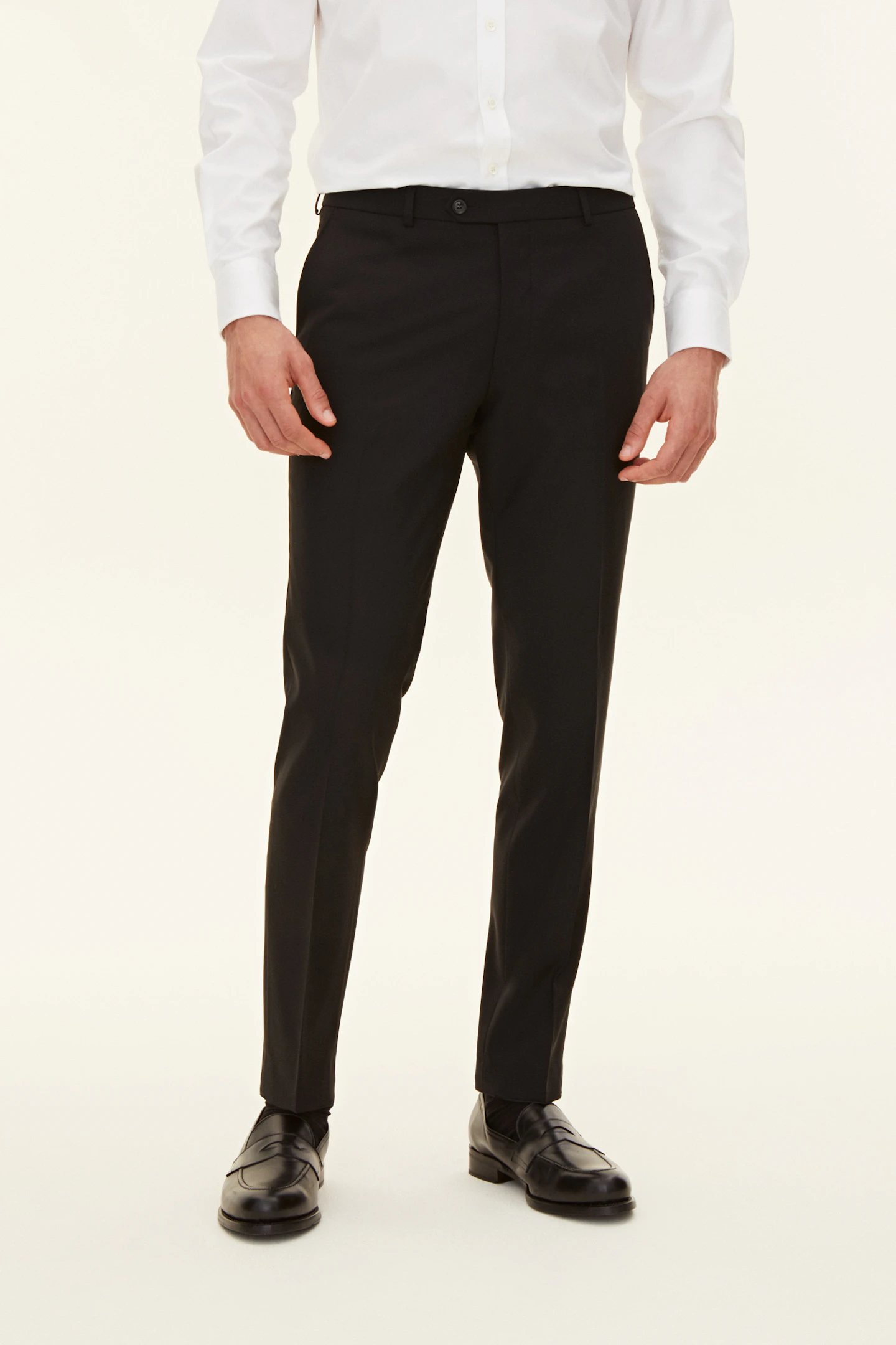 Klassiska kostymbyxor i slitstark super 120's-ull. Den här modellen har en avsmalnande passform och en klassisk byxlängd som precis nuddar skon och bildar ett elegant bryt.