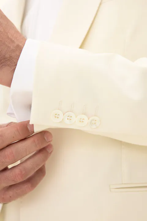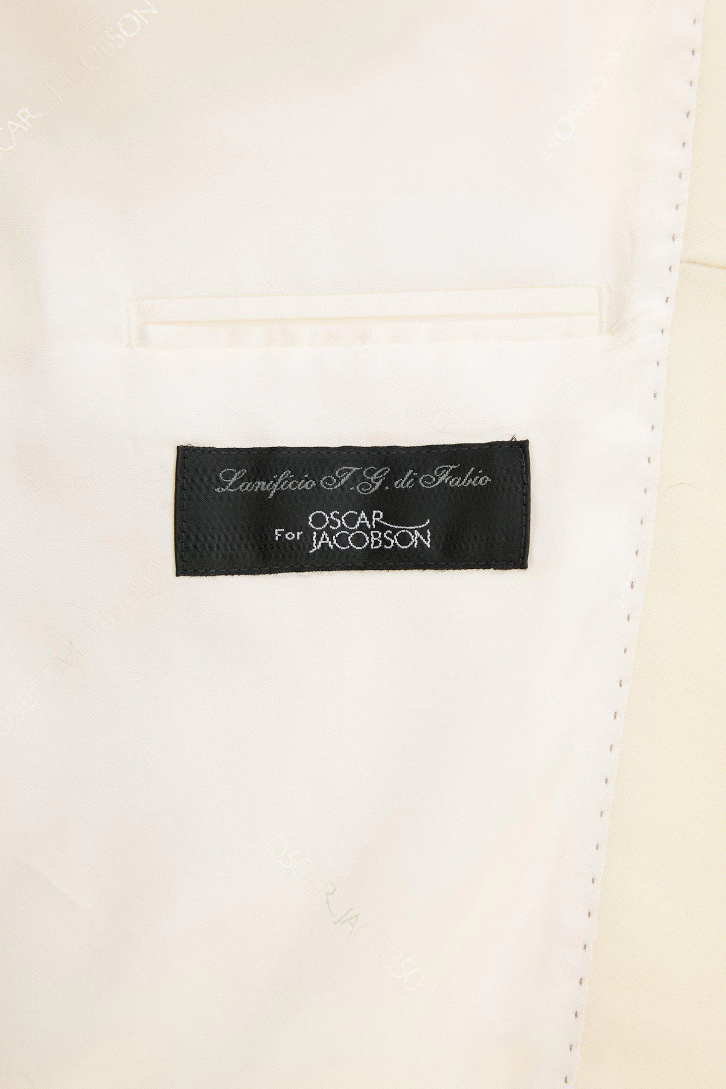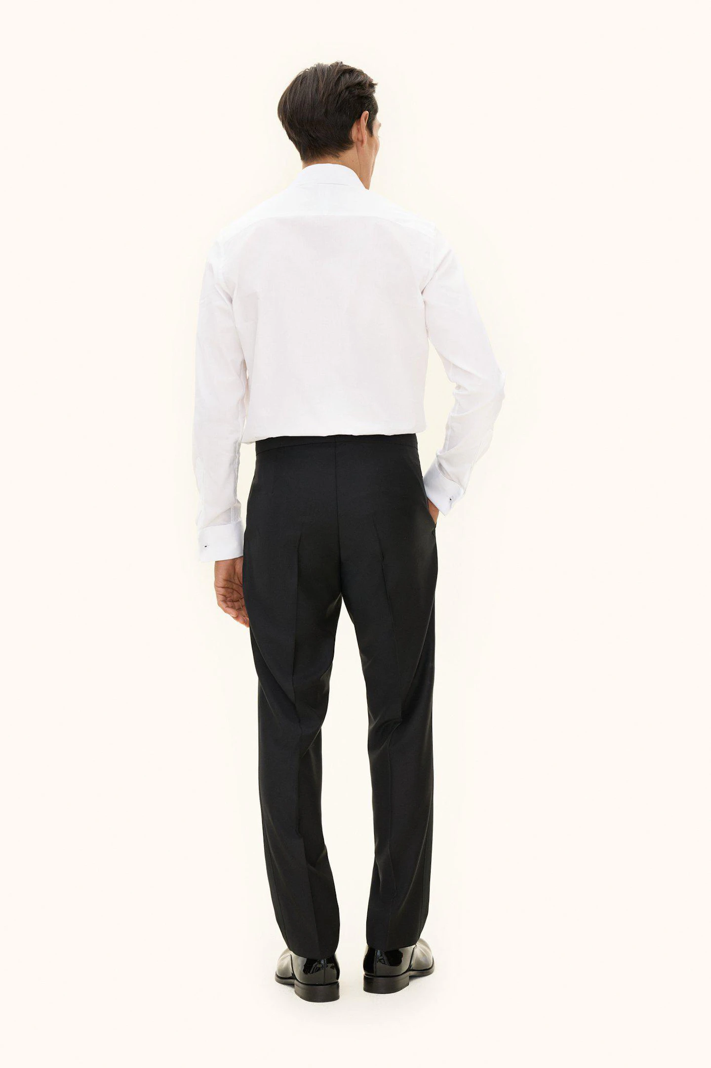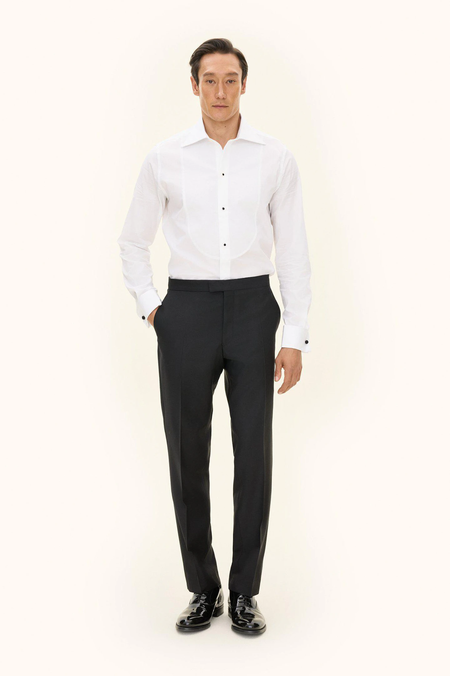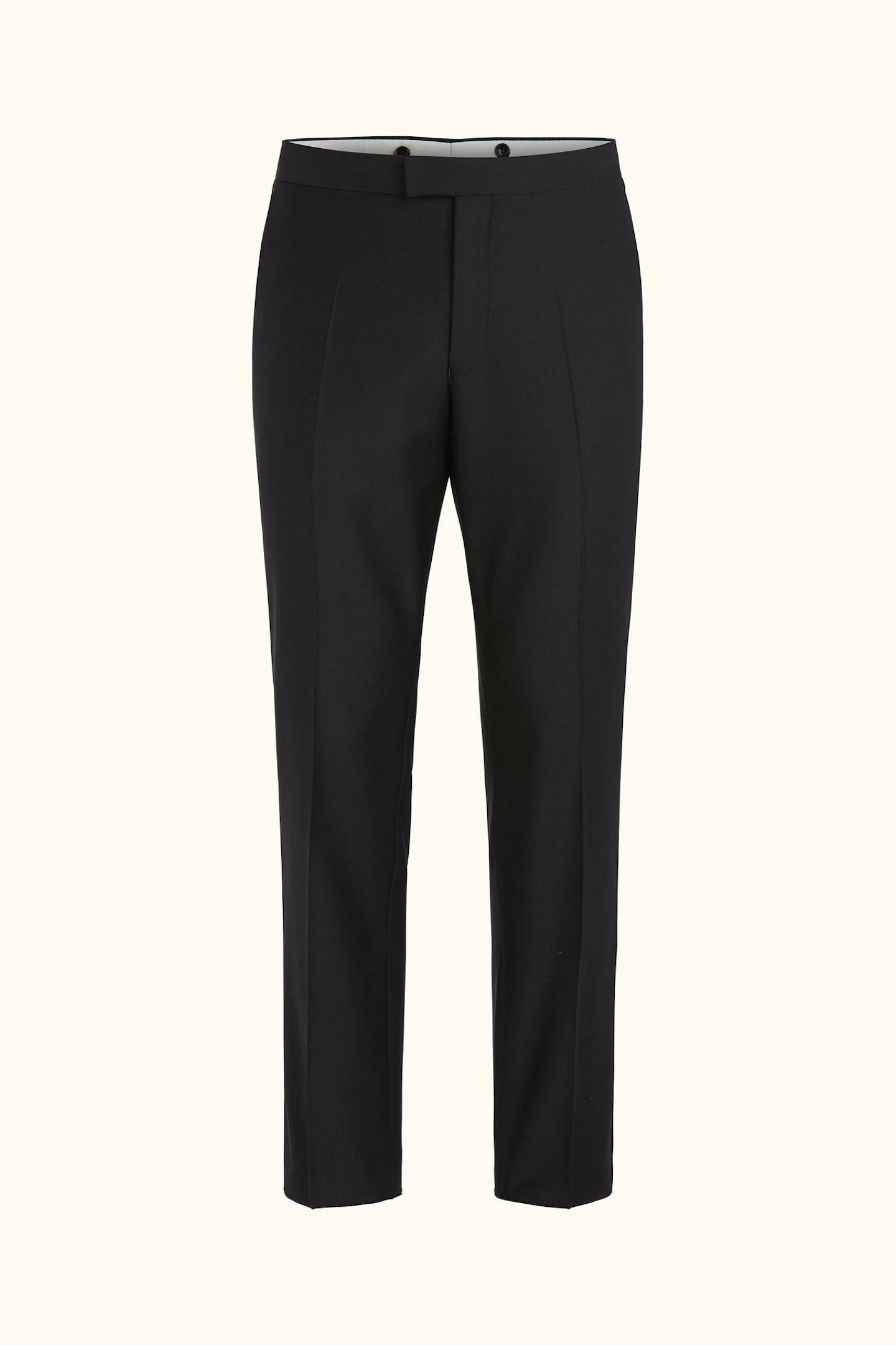 Helfodrad smoking i regular fit, med konstruerad axel och breda spetsiga slag i siden. Tillverkad i ett mycket fint vävt tyg av 100% ull. Tillhörande smokingbyxor med klassiska sidenrevärer.