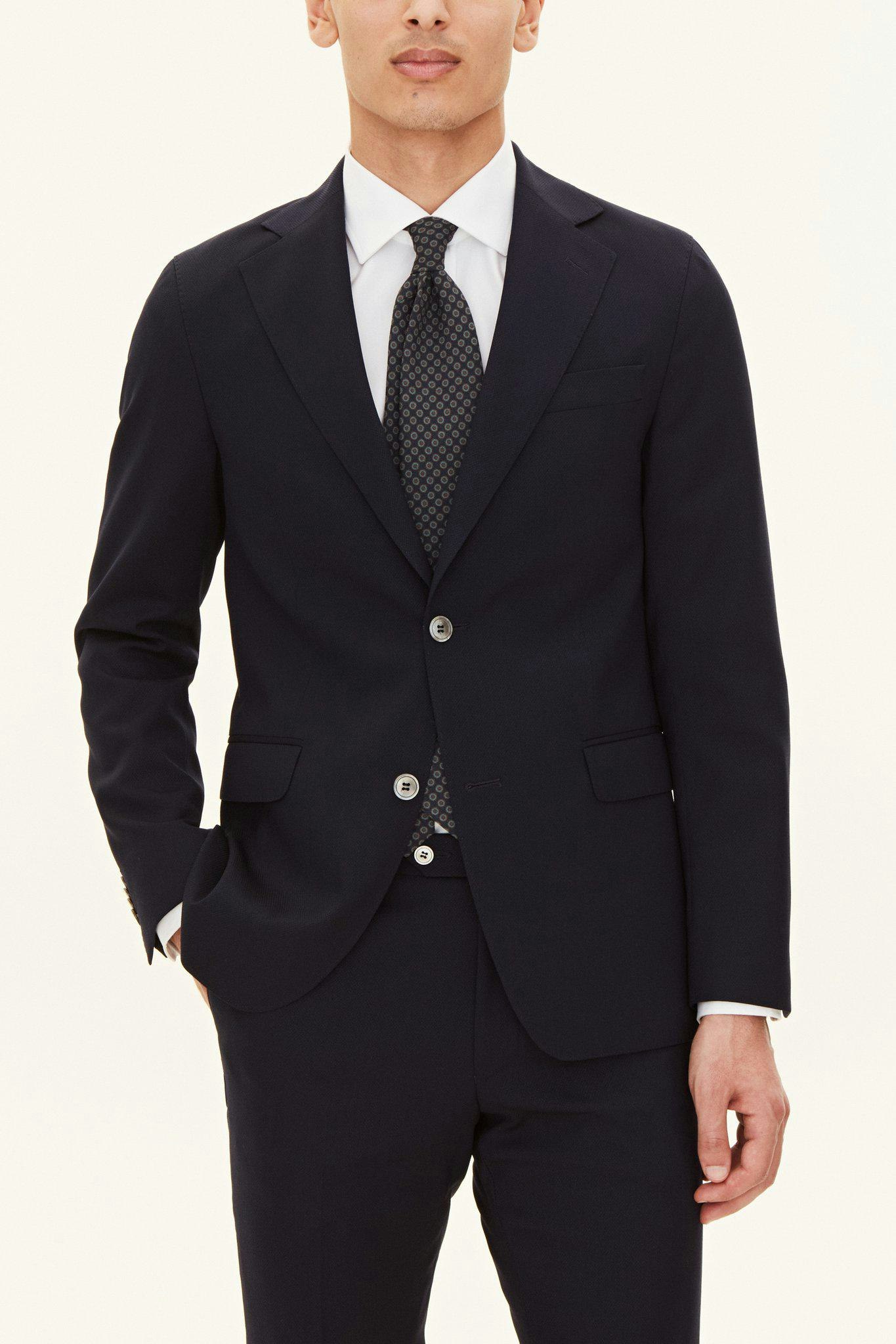 Helfodrad kostym som tack vare sin fantastiska ullstruktur med naturliga stretch faller in i kategorin "travel suit". Ett slitstarkt och inte minst skrynkeltåligt plagg som lämpar sig väl för daglig användning. Modellen har en smal passform som ger en smakfullt skräddad silhuett utan att kännas tajt. Axeln är lätt uppbyggd och fickorna har klassiska ficklock.