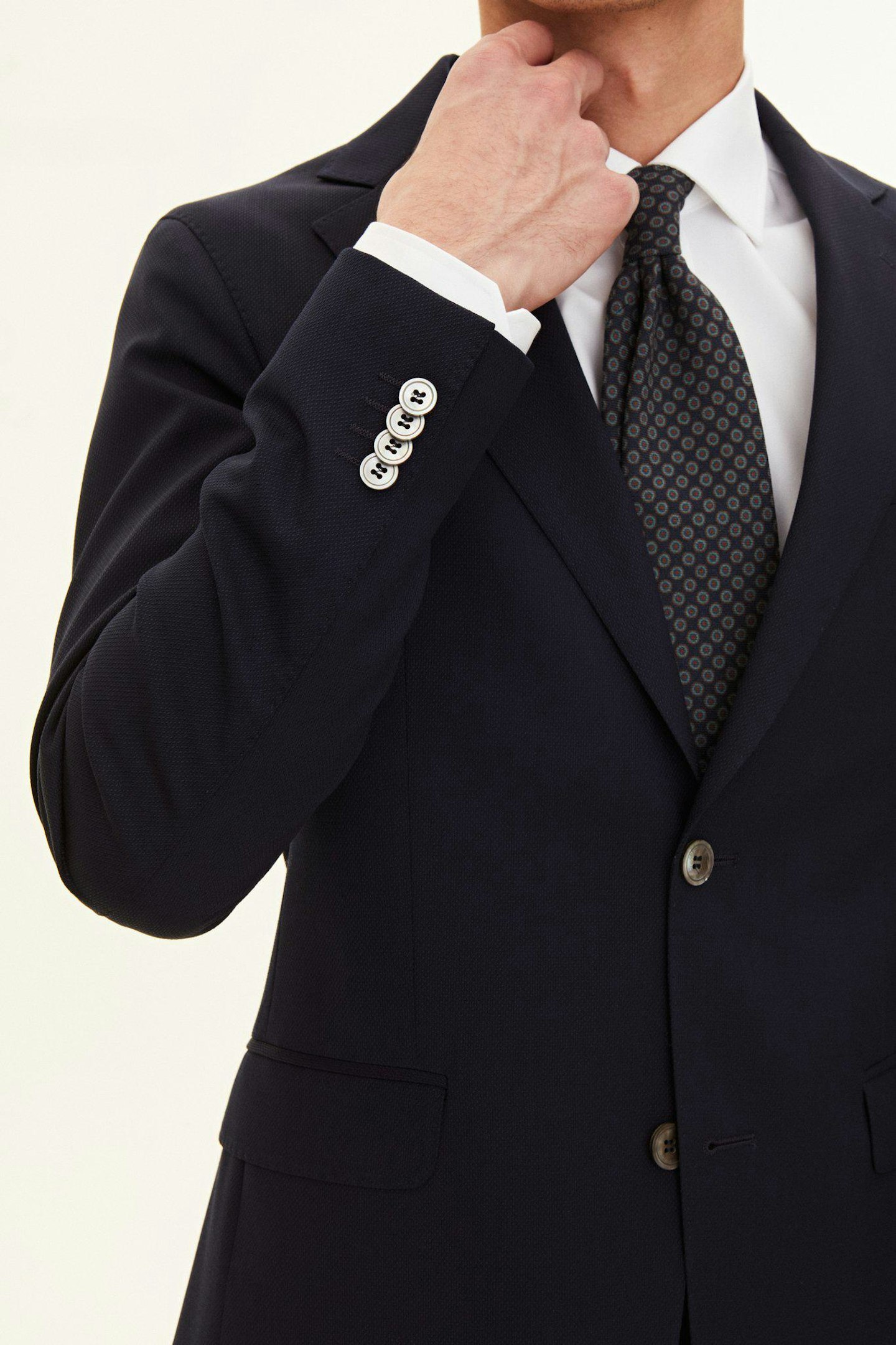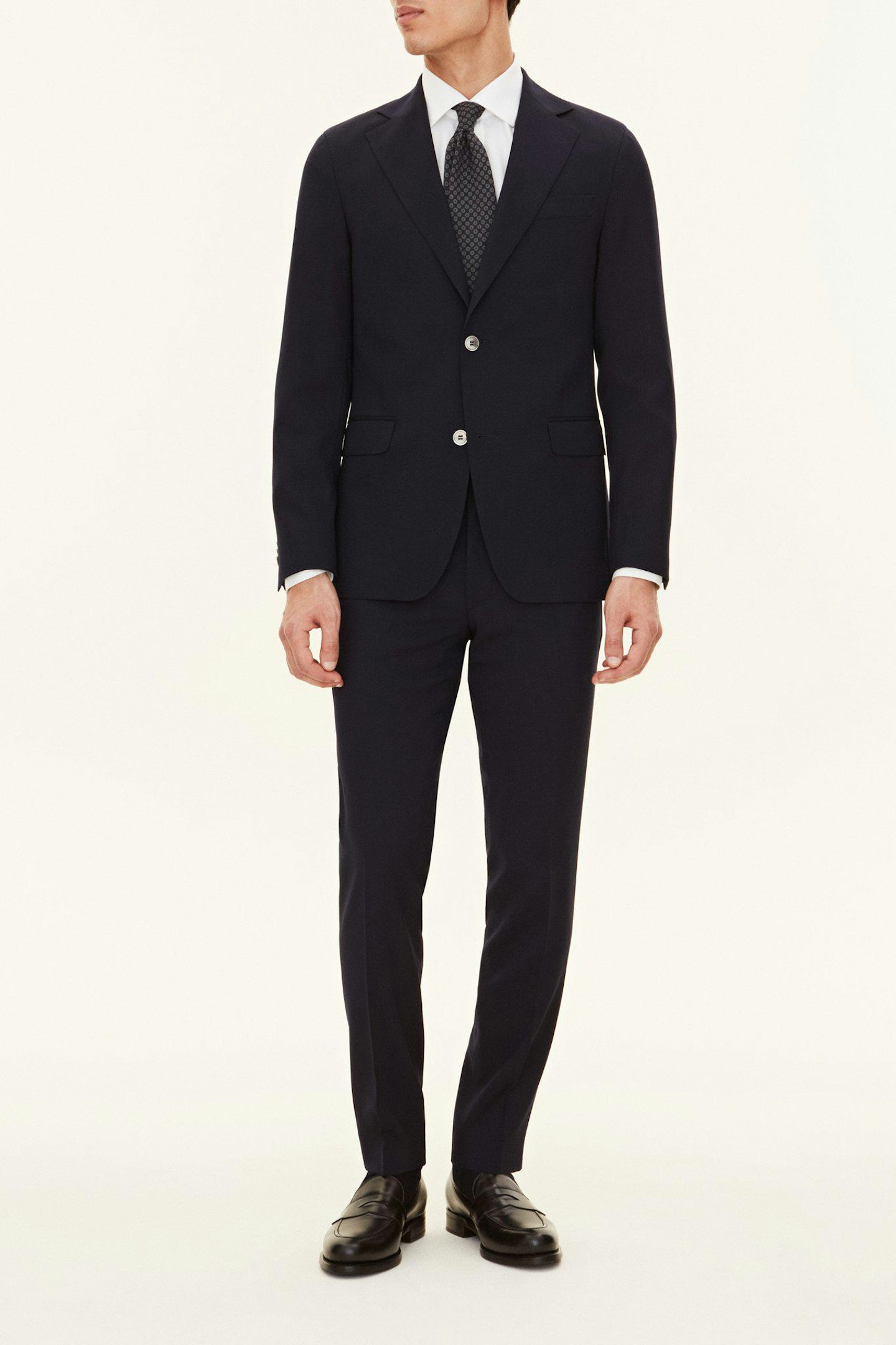 Helfodrad kostym som tack vare sin fantastiska ullstruktur med naturliga stretch faller in i kategorin "travel suit". Ett slitstarkt och inte minst skrynkeltåligt plagg som lämpar sig väl för daglig användning. Modellen har en smal passform som ger en smakfullt skräddad silhuett utan att kännas tajt. Axeln är lätt uppbyggd och fickorna har klassiska ficklock.
