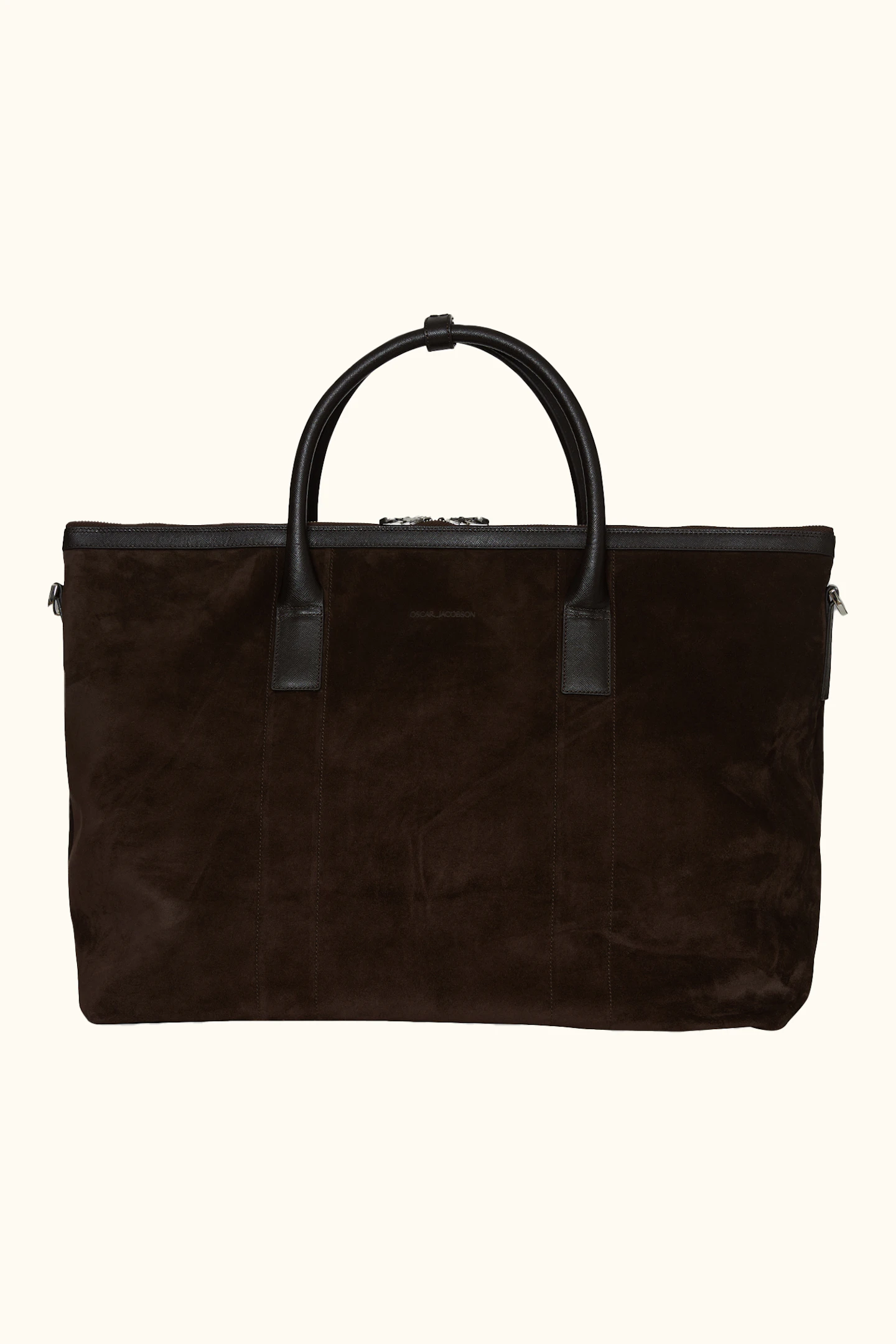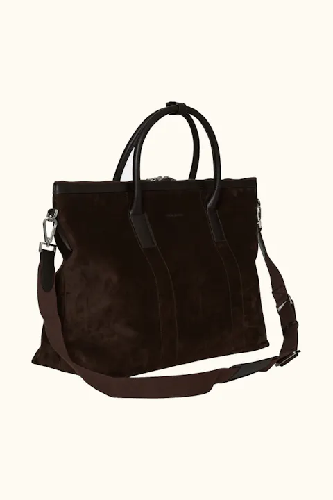 Handgjord Weekend Bag i en Italiensk finfibrig mocka, med detaljer i Saffiano-läder, tillverkat i Almansa-regionen där de har en lång tradition av läderhantverk. Väskan har tre innerfickor, ett större utrymme för packning och kommer med en tillhörande justerbar axelrem. Väskan framtagen för att rymma en lätt weekend-packning med skor och ombyte och har en läderrem i fodret för infästning av vårt Grooming Case. Nitad botten för bättre slitstyrka. Mått: 47x19x37 cm